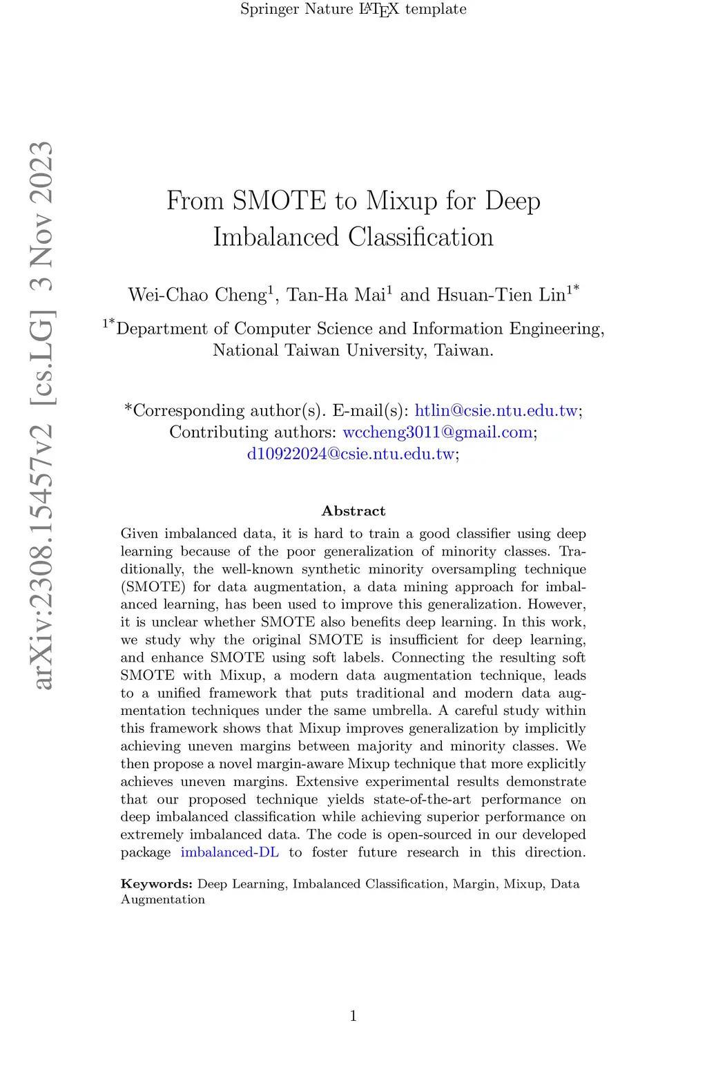 Given imbalanced data, it is hard to train a good classifier using deep learning because of the poor generalization of minority classes. Traditionally, the well-known synthetic minority oversampling technique (SMOTE) for data augmentation, a data mining approach for imbalanced learning, has been used to improve this generalization. However, it is unclear whether SMOTE also benefits deep learning. In this work, we study why the original SMOTE is insufficient for deep learning, and enhance SMOTE using soft labels. Connecting the resulting soft SMOTE with Mixup, a modern data augmentation technique, leads to a unified framework that puts traditional and modern data augmentation techniques under the same umbrella. A careful study within this framework shows that Mixup improves generalization by implicitly achieving uneven margins between majority and minority classes. We then propose a novel margin-aware Mixup technique that more explicitly achieves uneven margins. Extensive experimental results demonstrate that our proposed technique yields state-of-the-art performance on deep imbalanced classification while achieving superior performance on extremely imbalanced data. The code is open-sourced in our developed package https://github.com/ntucllab/imbalanced-DL to foster future research in this direction.