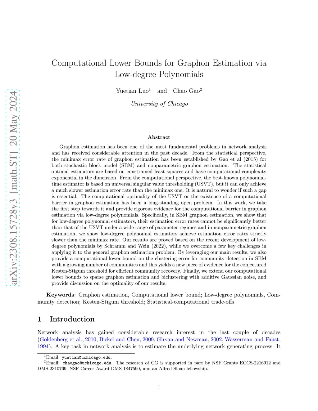 Graphon estimation has been one of the most fundamental problems in network analysis and has received considerable attention in the past decade. From the statistical perspective, the minimax error rate of graphon estimation has been established by Gao et al (2015) for both stochastic block model and nonparametric graphon estimation. The statistical optimal estimators are based on constrained least squares and have computational complexity exponential in the dimension. From the computational perspective, the best-known polynomial-time estimator is based universal singular value thresholding, but it can only achieve a much slower estimation error rate than the minimax one. The computational optimality of the USVT or the existence of a computational barrier in graphon estimation has been a long-standing open problem. In this work, we provide rigorous evidence for the computational barrier in graphon estimation via low-degree polynomials. Specifically, in SBM graphon estimation, we show that for low-degree polynomial estimators, their estimation error rates cannot be significantly better than that of the USVT under a wide range of parameter regimes and in nonparametric graphon estimation, we show low-degree polynomial estimators achieve estimation error rates strictly slower than the minimax rate. Our results are proved based on the recent development of low-degree polynomials by Schramm and Wein (2022), while we overcome a few key challenges in applying it to the general graphon estimation problem. By leveraging our main results, we also provide a computational lower bound on the clustering error for community detection in SBM with a growing number of communities and this yields a new piece of evidence for the conjectured Kesten-Stigum threshold for efficient community recovery. Finally, we extend our computational lower bounds to sparse graphon estimation and biclustering.