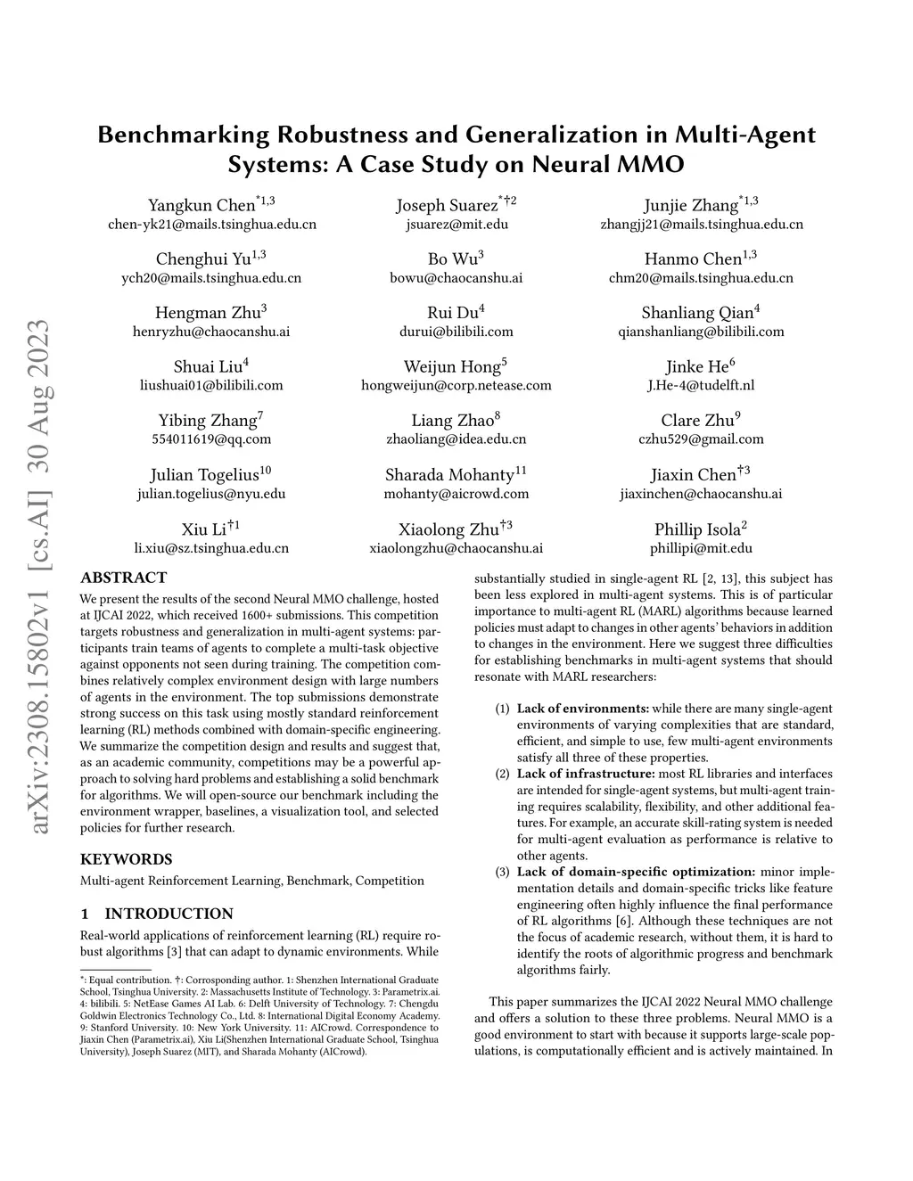 We present the results of the second Neural MMO challenge, hosted at IJCAI 2022, which received 1600+ submissions. This competition targets robustness and generalization in multi-agent systems: participants train teams of agents to complete a multi-task objective against opponents not seen during training. The competition combines relatively complex environment design with large numbers of agents in the environment. The top submissions demonstrate strong success on this task using mostly standard reinforcement learning (RL) methods combined with domain-specific engineering. We summarize the competition design and results and suggest that, as an academic community, competitions may be a powerful approach to solving hard problems and establishing a solid benchmark for algorithms. We will open-source our benchmark including the environment wrapper, baselines, a visualization tool, and selected policies for further research.