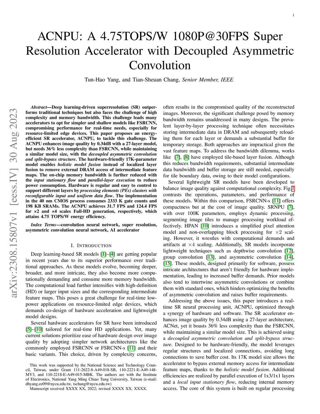 Deep learning-driven superresolution (SR) outperforms traditional techniques but also faces the challenge of high complexity and memory bandwidth. This challenge leads many accelerators to opt for simpler and shallow models like FSRCNN, compromising performance for real-time needs, especially for resource-limited edge devices. This paper proposes an energy-efficient SR accelerator, ACNPU, to tackle this challenge. The ACNPU enhances image quality by 0.34dB with a 27-layer model, but needs 36\% less complexity than FSRCNN, while maintaining a similar model size, with the \textit{decoupled asymmetric convolution and split-bypass structure}. The hardware-friendly 17K-parameter model enables \textit{holistic model fusion} instead of localized layer fusion to remove external DRAM access of intermediate feature maps. The on-chip memory bandwidth is further reduced with the \textit{input stationary flow} and \textit{parallel-layer execution} to reduce power consumption. Hardware is regular and easy to control to support different layers by \textit{processing elements (PEs) clusters with reconfigurable input and uniform data flow}. The implementation in the 40 nm CMOS process consumes 2333 K gate counts and 198KB SRAMs. The ACNPU achieves 31.7 FPS and 124.4 FPS for x2 and x4 scales Full-HD generation, respectively, which attains 4.75 TOPS/W energy efficiency.