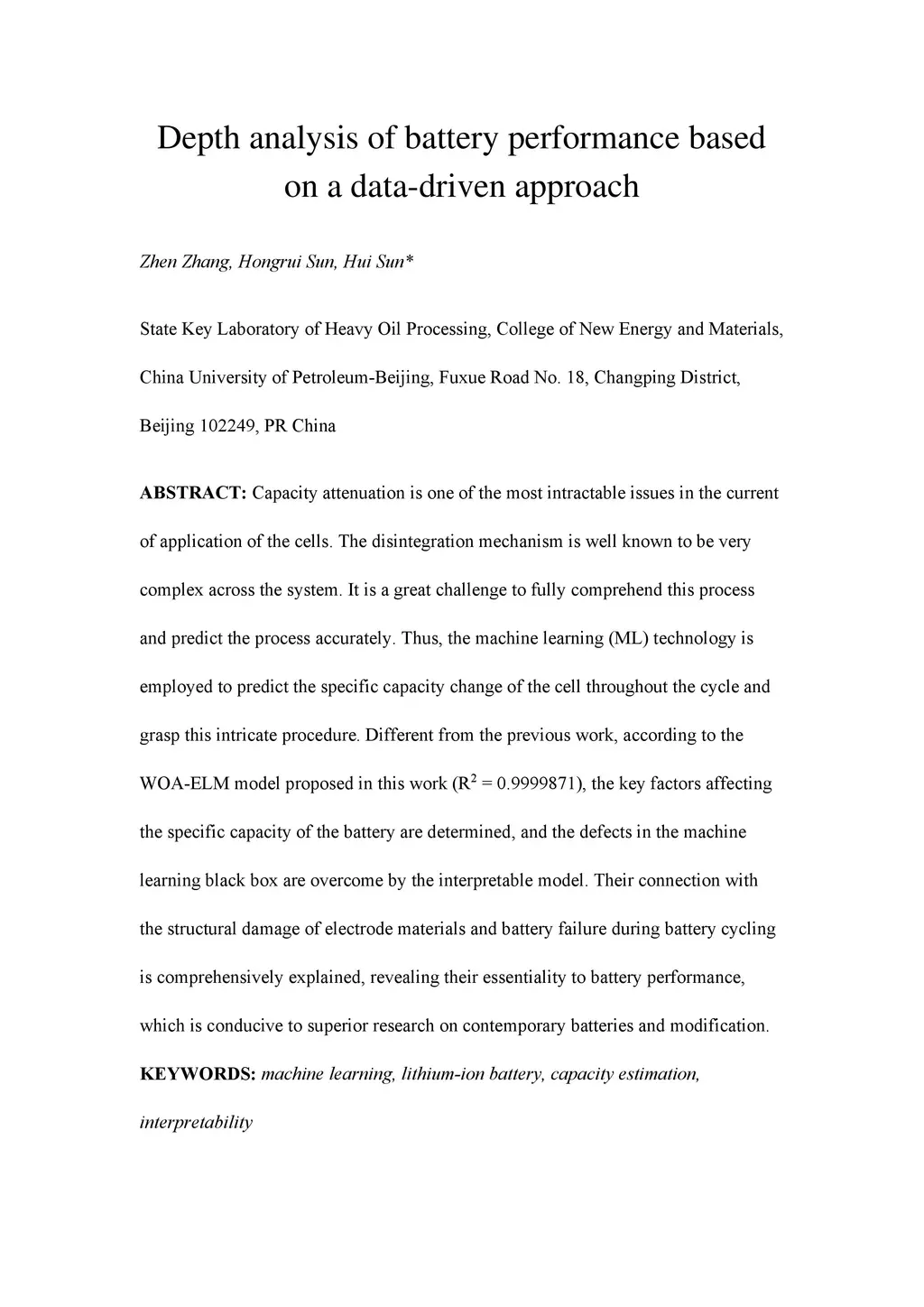 Capacity attenuation is one of the most intractable issues in the current of application of the cells. The disintegration mechanism is well known to be very complex across the system. It is a great challenge to fully comprehend this process and predict the process accurately. Thus, the machine learning (ML) technology is employed to predict the specific capacity change of the cell throughout the cycle and grasp this intricate procedure. Different from the previous work, according to the WOA-ELM model proposed in this work (R2 = 0.9999871), the key factors affecting the specific capacity of the battery are determined, and the defects in the machine learning black box are overcome by the interpretable model. Their connection with the structural damage of electrode materials and battery failure during battery cycling is comprehensively explained, revealing their essentiality to battery performance, which is conducive to superior research on contemporary batteries and modification.