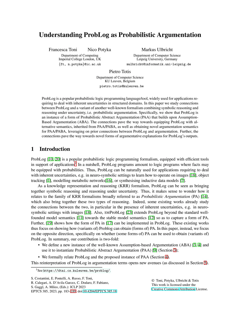 Understanding ProbLog as Probabilistic Argumentation
