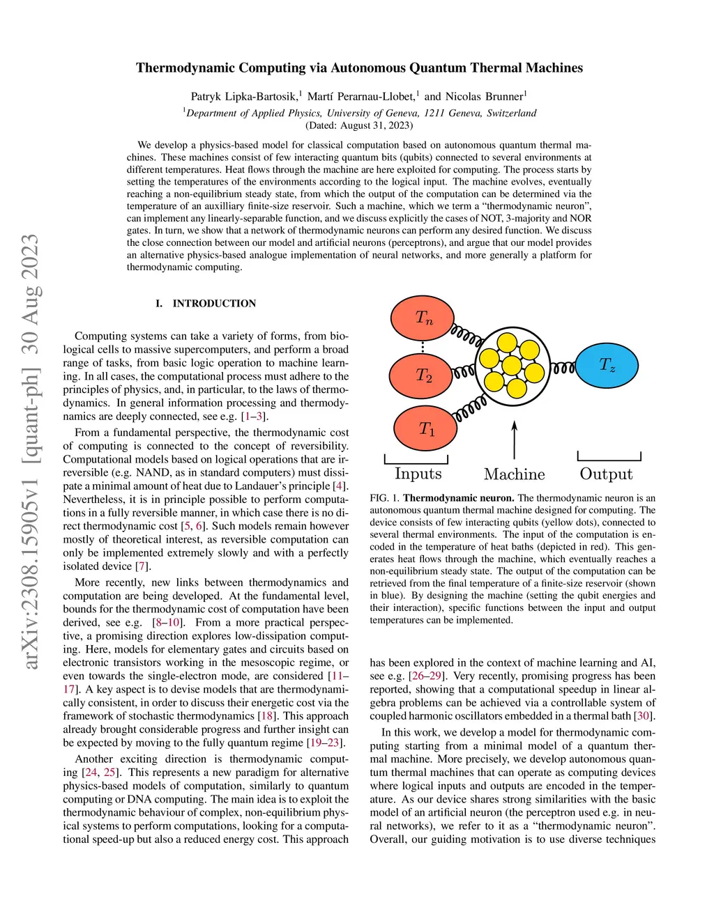 We develop a physics-based model for classical computation based on autonomous quantum thermal machines. These machines consist of few interacting quantum bits (qubits) connected to several environments at different temperatures. Heat flows through the machine are here exploited for computing. The process starts by setting the temperatures of the environments according to the logical input. The machine evolves, eventually reaching a non-equilibrium steady state, from which the output of the computation can be determined via the temperature of an auxilliary finite-size reservoir. Such a machine, which we term a ``thermodynamic neuron'', can implement any linearly-separable function, and we discuss explicitly the cases of NOT, 3-MAJORITY and NOR gates. In turn, we show that a network of thermodynamic neurons can perform any desired function. We discuss the close connection between our model and artificial neurons (perceptrons), and argue that our model provides an alternative physics-based analogue implementation of neural networks, and more generally a platform for thermodynamic computing.