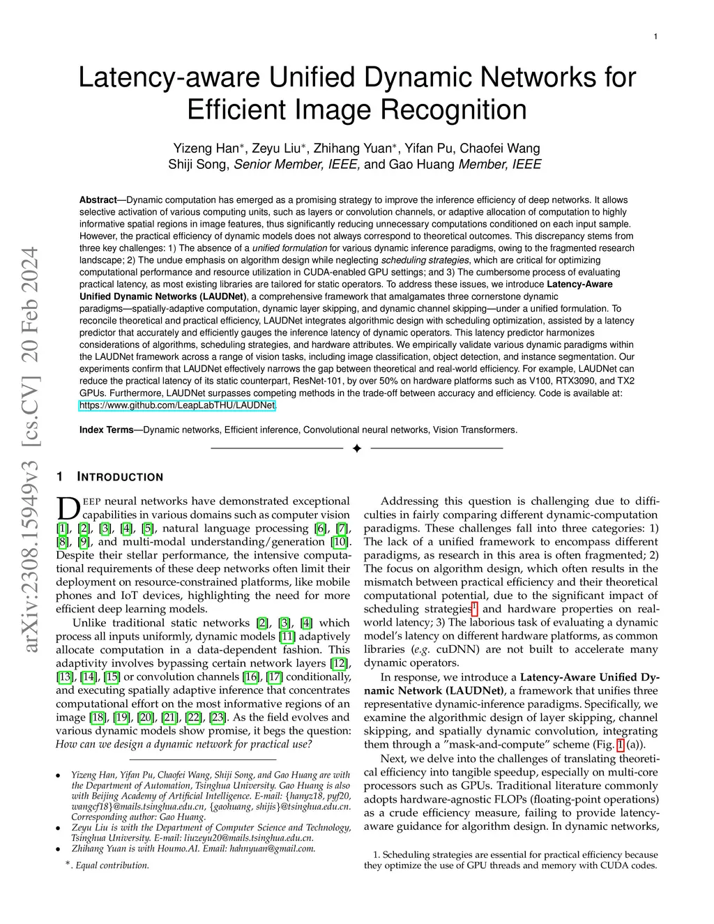 Dynamic computation has emerged as a promising avenue to enhance the inference efficiency of deep networks. It allows selective activation of computational units, leading to a reduction in unnecessary computations for each input sample. However, the actual efficiency of these dynamic models can deviate from theoretical predictions. This mismatch arises from: 1) the lack of a unified approach due to fragmented research; 2) the focus on algorithm design over critical scheduling strategies, especially in CUDA-enabled GPU contexts; and 3) challenges in measuring practical latency, given that most libraries cater to static operations. Addressing these issues, we unveil the Latency-Aware Unified Dynamic Networks (LAUDNet), a framework that integrates three primary dynamic paradigms-spatially adaptive computation, dynamic layer skipping, and dynamic channel skipping. To bridge the theoretical and practical efficiency gap, LAUDNet merges algorithmic design with scheduling optimization, guided by a latency predictor that accurately gauges dynamic operator latency. We've tested LAUDNet across multiple vision tasks, demonstrating its capacity to notably reduce the latency of models like ResNet-101 by over 50% on platforms such as V100, RTX3090, and TX2 GPUs. Notably, LAUDNet stands out in balancing accuracy and efficiency. Code is available at: https://www.github.com/LeapLabTHU/LAUDNet.