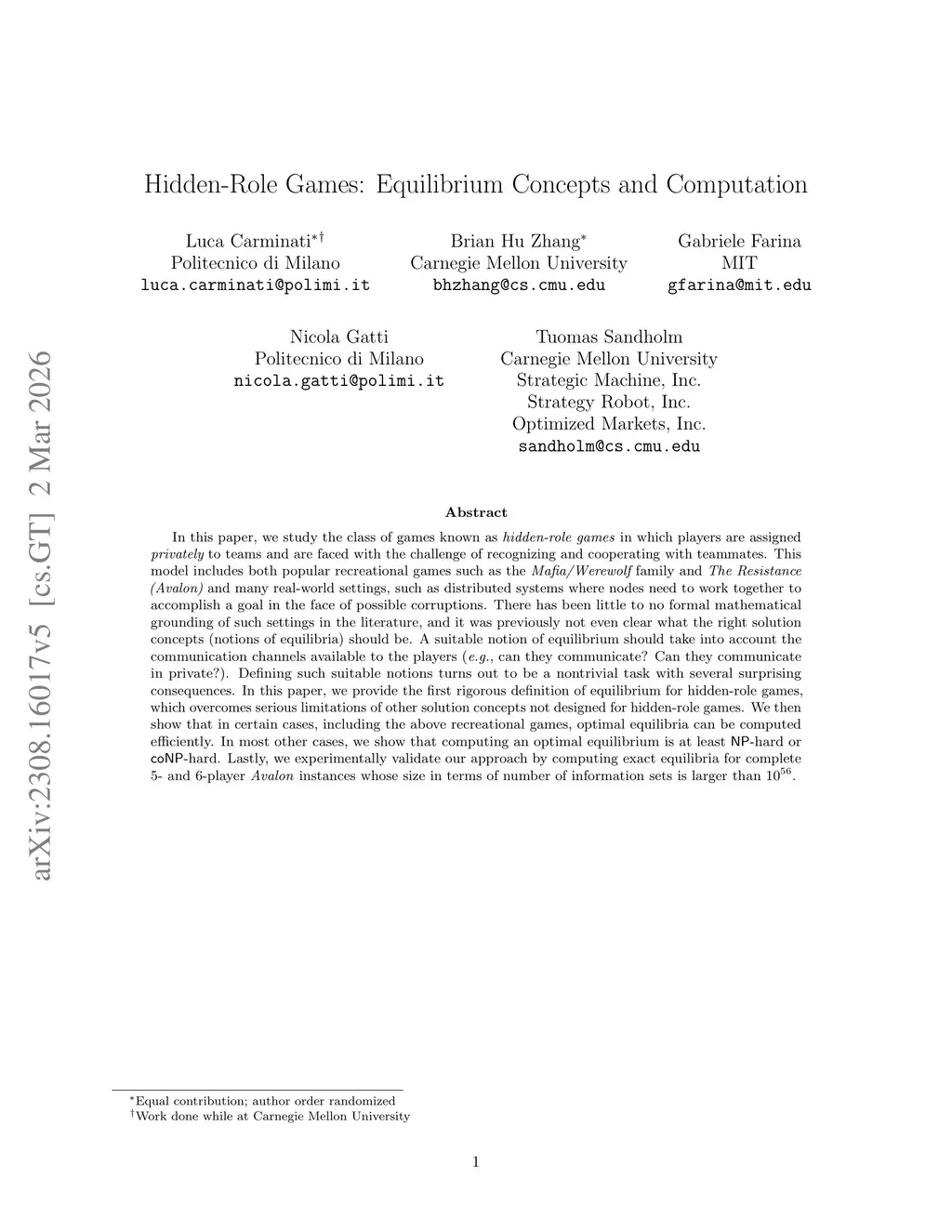 In this paper, we study the class of games known as hidden-role games in which players are assigned privately to teams and are faced with the challenge of recognizing and cooperating with teammates. This model includes both popular recreational games such as the Mafia/Werewolf family and The Resistance (Avalon) and many real-world settings, such as distributed systems where nodes need to work together to accomplish a goal in the face of possible corruptions. There has been little to no formal mathematical grounding of such settings in the literature, and it was previously not even clear what the right solution concepts (notions of equilibria) should be. A suitable notion of equilibrium should take into account the communication channels available to the players (e.g., can they communicate? Can they communicate in private?). Defining such suitable notions turns out to be a nontrivial task with several surprising consequences. In this paper, we provide the first rigorous definition of equilibrium for hidden-role games, which overcomes serious limitations of other solution concepts not designed for hidden-role games. We then show that in certain cases, including the above recreational games, optimal equilibria can be computed efficiently. In most other cases, we show that computing an optimal equilibrium is at least NP-hard or coNP-hard. Lastly, we experimentally validate our approach by computing exact equilibria for complete 5- and 6-player Avalon instances whose size in terms of number of information sets is larger than .