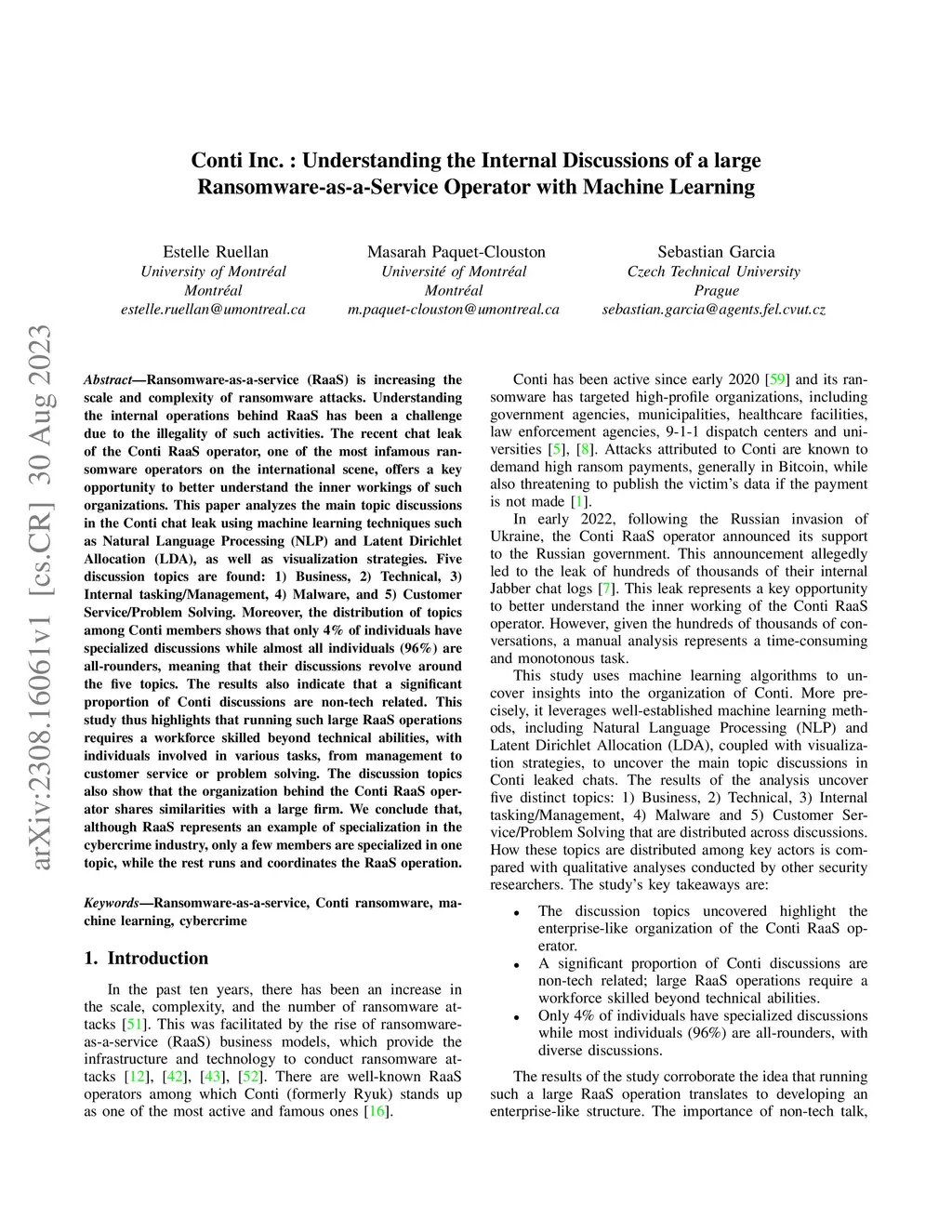 Conti Inc.: Understanding the Internal Discussions of a large Ransomware-as-a-Service Operator with Machine Learning