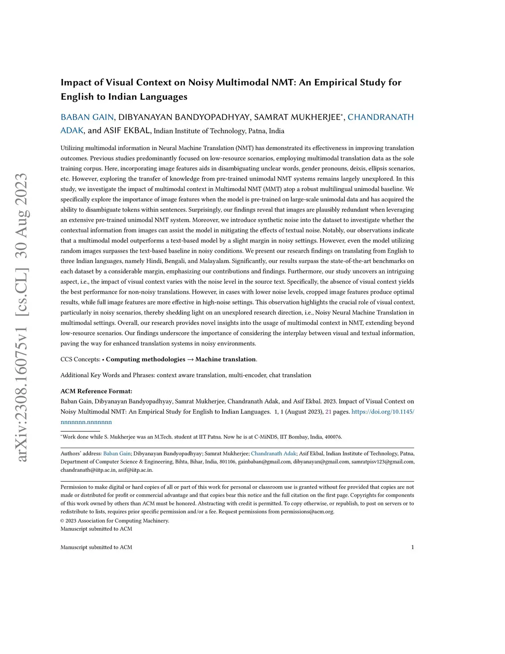 Impact of Visual Context on Noisy Multimodal NMT: An Empirical Study for English to Indian Languages
