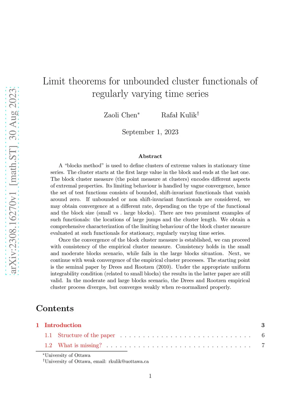 A blocks method is used to define clusters of extreme values in stationary time series. The cluster starts at the first large value in the block and ends at the last one. The block cluster measure (the point measure at clusters) encodes different aspects of extremal properties. Its limiting behaviour is handled by vague convergence, hence the set of test functions consists of bounded, shift-invariant functionals that vanish around zero. If unbounded or non shift-invariant functionals are considered, we may obtain convergence at a different rate, depending on the type of the functional and the block size (small vs. large blocks). There are two prominent examples of such functionals: the locations of large jumps and the cluster length. We obtain a comprehensive characterization of the limiting behaviour of the block cluster measure evaluated at such functionals for stationary, regularly varying time series. Once the convergence of the block cluster measure is established, we can proceed with consistency of the empirical cluster measure. Consistency holds in the small and moderate blocks scenario, while fails in the large blocks situation. Next, we continue with weak convergence of the empirical cluster processes. The starting point is the seminal paper by Drees and Rootzen (2010). Under the appropriate uniform integrability condition (related to small blocks) the results in the latter paper are still valid. In the moderate and large blocks scenario, the Drees and Rootzen empirical cluster process diverges, but converges weakly when re-normalized properly.
