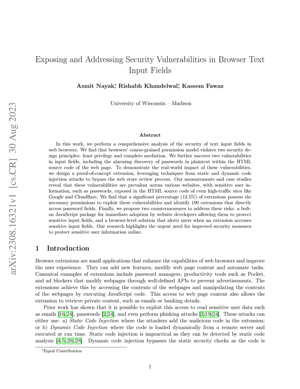 In this work, we perform a comprehensive analysis of the security of text input fields in web browsers. We find that browsers' coarse-grained permission model violates two security design principles: least privilege and complete mediation. We further uncover two vulnerabilities in input fields, including the alarming discovery of passwords in plaintext within the HTML source code of the web page. To demonstrate the real-world impact of these vulnerabilities, we design a proof-of-concept extension, leveraging techniques from static and dynamic code injection attacks to bypass the web store review process. Our measurements and case studies reveal that these vulnerabilities are prevalent across various websites, with sensitive user information, such as passwords, exposed in the HTML source code of even high-traffic sites like Google and Cloudflare. We find that a significant percentage (12.5\%) of extensions possess the necessary permissions to exploit these vulnerabilities and identify 190 extensions that directly access password fields. Finally, we propose two countermeasures to address these risks: a bolt-on JavaScript package for immediate adoption by website developers allowing them to protect sensitive input fields, and a browser-level solution that alerts users when an extension accesses sensitive input fields. Our research highlights the urgent need for improved security measures to protect sensitive user information online.