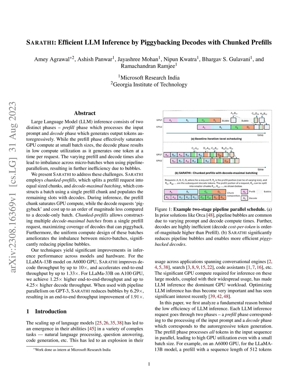 SARATHI: Efficient LLM Inference by Piggybacking Decodes with Chunked