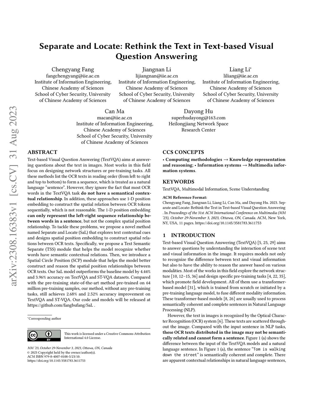 Text-based Visual Question Answering (TextVQA) aims at answering questions about the text in images. Most works in this field focus on designing network structures or pre-training tasks. All these methods list the OCR texts in reading order (from left to right and top to bottom) to form a sequence, which is treated as a natural language ``sentence''. However, they ignore the fact that most OCR words in the TextVQA task do not have a semantical contextual relationship. In addition, these approaches use 1-D position embedding to construct the spatial relation between OCR tokens sequentially, which is not reasonable. The 1-D position embedding can only represent the left-right sequence relationship between words in a sentence, but not the complex spatial position relationship. To tackle these problems, we propose a novel method named Separate and Locate (SaL) that explores text contextual cues and designs spatial position embedding to construct spatial relations between OCR texts. Specifically, we propose a Text Semantic Separate (TSS) module that helps the model recognize whether words have semantic contextual relations. Then, we introduce a Spatial Circle Position (SCP) module that helps the model better construct and reason the spatial position relationships between OCR texts. Our SaL model outperforms the baseline model by 4.44% and 3.96% accuracy on TextVQA and ST-VQA datasets. Compared with the pre-training state-of-the-art method pre-trained on 64 million pre-training samples, our method, without any pre-training tasks, still achieves 2.68% and 2.52% accuracy improvement on TextVQA and ST-VQA. Our code and models will be released at https://github.com/fangbufang/SaL.