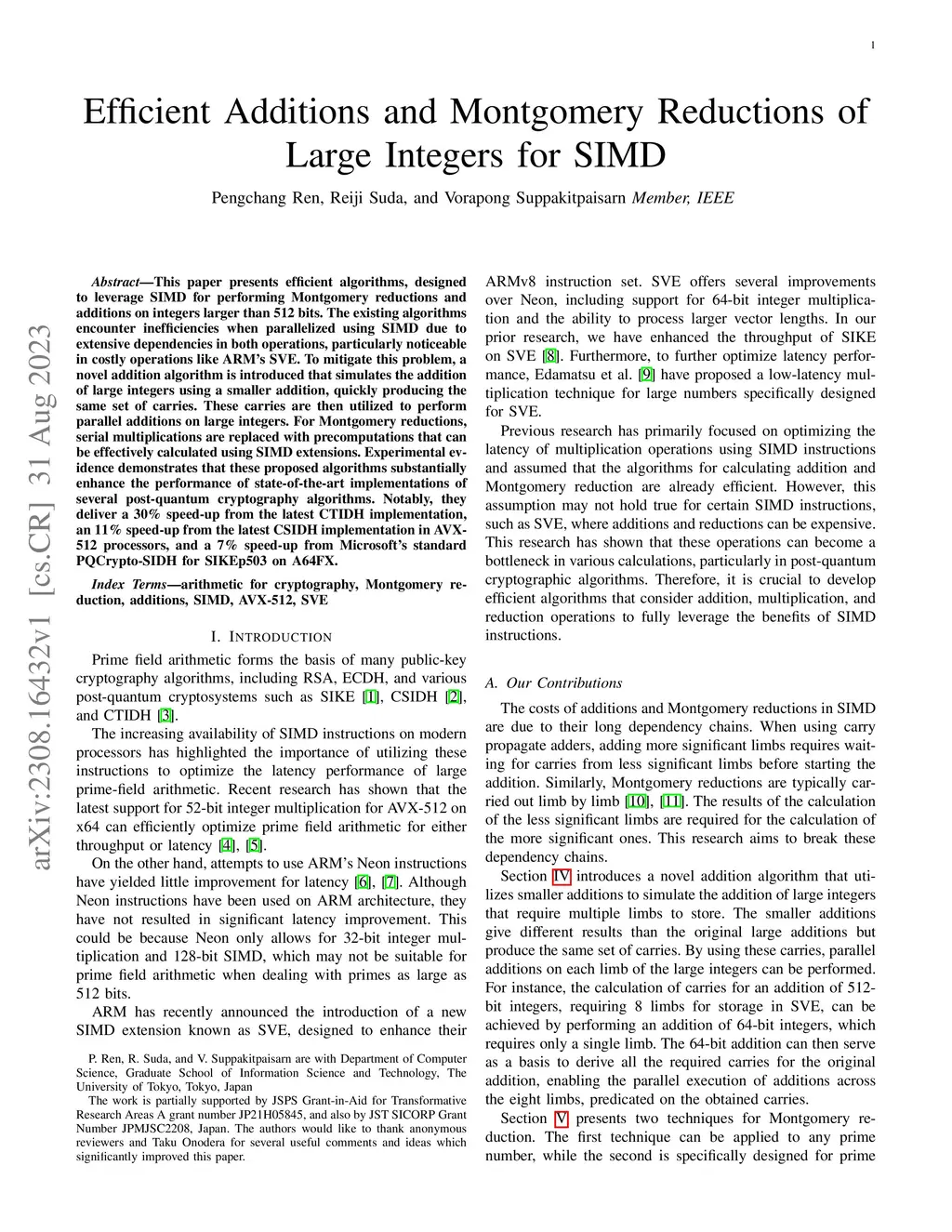 This paper presents efficient algorithms, designed to leverage SIMD for performing Montgomery reductions and additions on integers larger than 512 bits. The existing algorithms encounter inefficiencies when parallelized using SIMD due to extensive dependencies in both operations, particularly noticeable in costly operations like ARM's SVE. To mitigate this problem, a novel addition algorithm is introduced that simulates the addition of large integers using a smaller addition, quickly producing the same set of carries. These carries are then utilized to perform parallel additions on large integers. For Montgomery reductions, serial multiplications are replaced with precomputations that can be effectively calculated using SIMD extensions. Experimental evidence demonstrates that these proposed algorithms substantially enhance the performance of state-of-the-art implementations of several post-quantum cryptography algorithms. Notably, they deliver a 30% speed-up from the latest CTIDH implementation, an 11% speed-up from the latest CSIDH implementation in AVX-512 processors, and a 7% speed-up from Microsoft's standard PQCrypto-SIDH for SIKEp503 on A64FX.