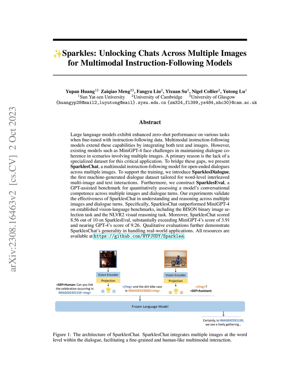 Large language models exhibit enhanced zero-shot performance on various tasks when fine-tuned with instruction-following data. Multimodal instruction-following models extend these capabilities by integrating both text and images. However, existing models such as MiniGPT-4 face challenges in maintaining dialogue coherence in scenarios involving multiple images. A primary reason is the lack of a specialized dataset for this critical application. To bridge these gaps, we present SparklesChat, a multimodal instruction-following model for open-ended dialogues across multiple images. To support the training, we introduce SparklesDialogue, the first machine-generated dialogue dataset tailored for word-level interleaved multi-image and text interactions. Furthermore, we construct SparklesEval, a GPT-assisted benchmark for quantitatively assessing a model's conversational competence across multiple images and dialogue turns. Our experiments validate the effectiveness of SparklesChat in understanding and reasoning across multiple images and dialogue turns. Specifically, SparklesChat outperformed MiniGPT-4 on established vision-and-language benchmarks, including the BISON binary image selection task and the NLVR2 visual reasoning task. Moreover, SparklesChat scored 8.56 out of 10 on SparklesEval, substantially exceeding MiniGPT-4's score of 3.91 and nearing GPT-4's score of 9.26. Qualitative evaluations further demonstrate SparklesChat's generality in handling real-world applications. All resources are available at https://github.com/HYPJUDY/Sparkles.