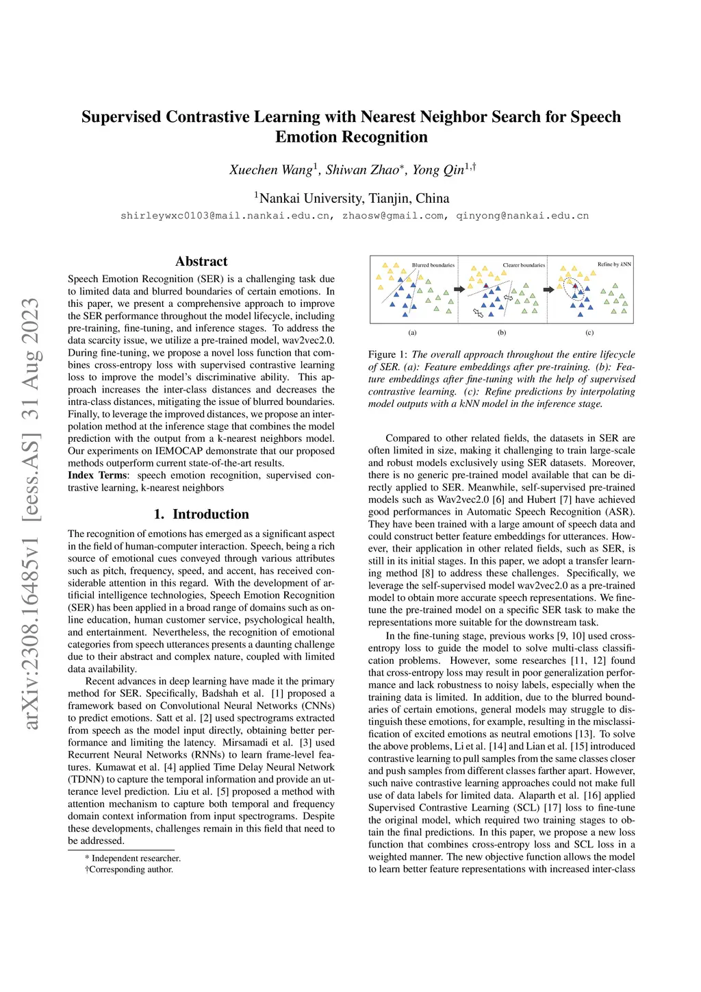 Speech Emotion Recognition (SER) is a challenging task due to limited data and blurred boundaries of certain emotions. In this paper, we present a comprehensive approach to improve the SER performance throughout the model lifecycle, including pre-training, fine-tuning, and inference stages. To address the data scarcity issue, we utilize a pre-trained model, wav2vec2.0. During fine-tuning, we propose a novel loss function that combines cross-entropy loss with supervised contrastive learning loss to improve the model's discriminative ability. This approach increases the inter-class distances and decreases the intra-class distances, mitigating the issue of blurred boundaries. Finally, to leverage the improved distances, we propose an interpolation method at the inference stage that combines the model prediction with the output from a k-nearest neighbors model. Our experiments on IEMOCAP demonstrate that our proposed methods outperform current state-of-the-art results.