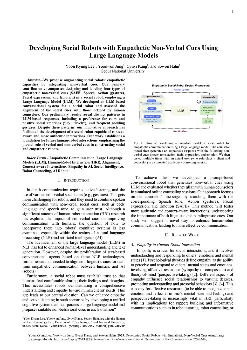 We propose augmenting the empathetic capacities of social robots by integrating non-verbal cues. Our primary contribution is the design and labeling of four types of empathetic non-verbal cues, abbreviated as SAFE: Speech, Action (gesture), Facial expression, and Emotion, in a social robot. These cues are generated using a Large Language Model (LLM). We developed an LLM-based conversational system for the robot and assessed its alignment with social cues as defined by human counselors. Preliminary results show distinct patterns in the robot's responses, such as a preference for calm and positive social emotions like 'joy' and 'lively', and frequent nodding gestures. Despite these tendencies, our approach has led to the development of a social robot capable of context-aware and more authentic interactions. Our work lays the groundwork for future studies on human-robot interactions, emphasizing the essential role of both verbal and non-verbal cues in creating social and empathetic robots.