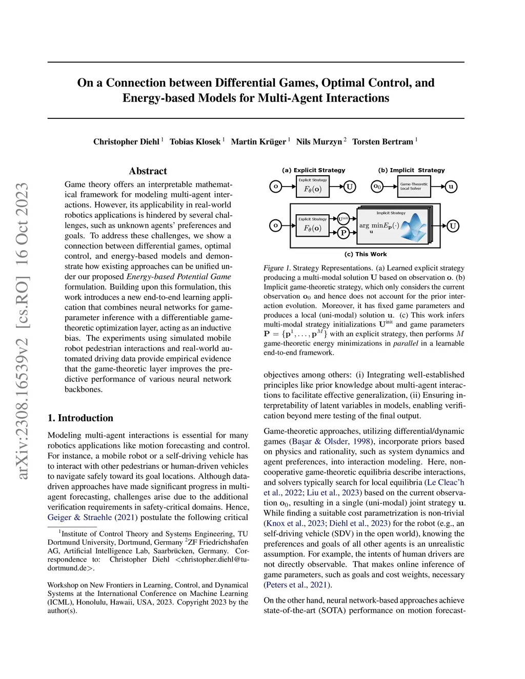 Game theory offers an interpretable mathematical framework for modeling multi-agent interactions. However, its applicability in real-world robotics applications is hindered by several challenges, such as unknown agents' preferences and goals. To address these challenges, we show a connection between differential games, optimal control, and energy-based models and demonstrate how existing approaches can be unified under our proposed Energy-based Potential Game formulation. Building upon this formulation, this work introduces a new end-to-end learning application that combines neural networks for game-parameter inference with a differentiable game-theoretic optimization layer, acting as an inductive bias. The experiments using simulated mobile robot pedestrian interactions and real-world automated driving data provide empirical evidence that the game-theoretic layer improves the predictive performance of various neural network backbones.