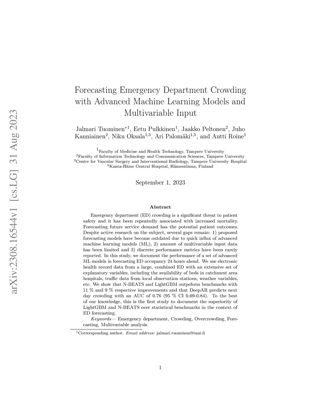 Emergency department (ED) crowding is a significant threat to patient safety and it has been repeatedly associated with increased mortality. Forecasting future service demand has the potential patient outcomes. Despite active research on the subject, several gaps remain: 1) proposed forecasting models have become outdated due to quick influx of advanced machine learning models (ML), 2) amount of multivariable input data has been limited and 3) discrete performance metrics have been rarely reported. In this study, we document the performance of a set of advanced ML models in forecasting ED occupancy 24 hours ahead. We use electronic health record data from a large, combined ED with an extensive set of explanatory variables, including the availability of beds in catchment area hospitals, traffic data from local observation stations, weather variables, etc. We show that N-BEATS and LightGBM outpeform benchmarks with 11 % and 9 % respective improvements and that DeepAR predicts next day crowding with an AUC of 0.76 (95 % CI 0.69-0.84). To the best of our knowledge, this is the first study to document the superiority of LightGBM and N-BEATS over statistical benchmarks in the context of ED forecasting.