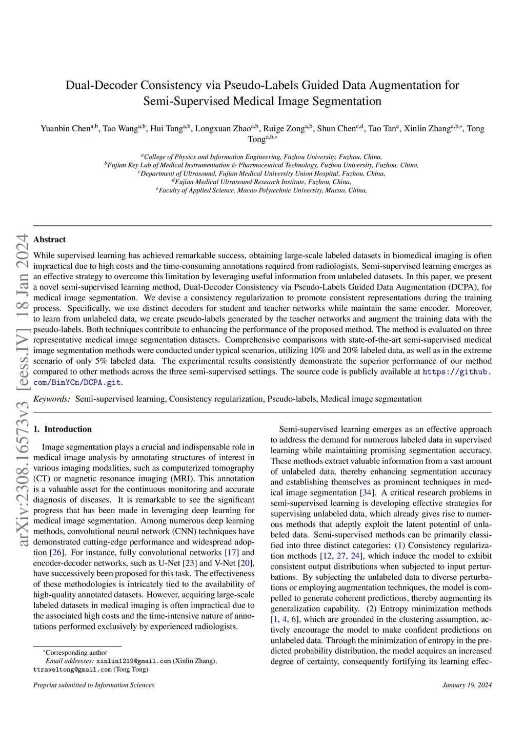 Dual-Decoder Consistency via Pseudo-Labels Guided Data Augmentation for