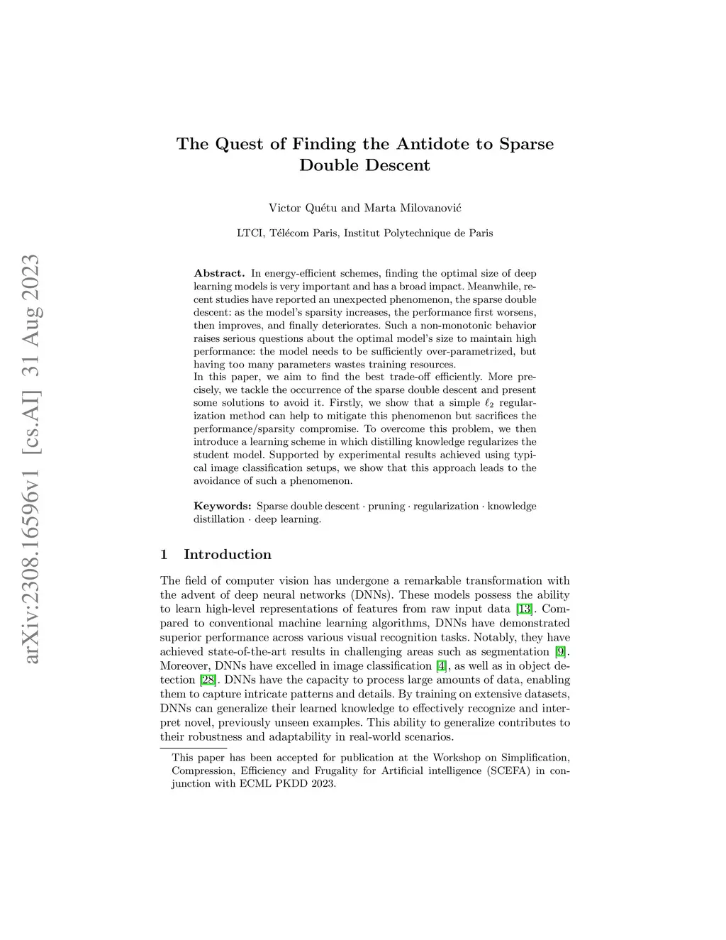 In energy-efficient schemes, finding the optimal size of deep learning models is very important and has a broad impact. Meanwhile, recent studies have reported an unexpected phenomenon, the sparse double descent: as the model's sparsity increases, the performance first worsens, then improves, and finally deteriorates. Such a non-monotonic behavior raises serious questions about the optimal model's size to maintain high performance: the model needs to be sufficiently over-parametrized, but having too many parameters wastes training resources. In this paper, we aim to find the best trade-off efficiently. More precisely, we tackle the occurrence of the sparse double descent and present some solutions to avoid it. Firstly, we show that a simple regularization method can help to mitigate this phenomenon but sacrifices the performance/sparsity compromise. To overcome this problem, we then introduce a learning scheme in which distilling knowledge regularizes the student model. Supported by experimental results achieved using typical image classification setups, we show that this approach leads to the avoidance of such a phenomenon.