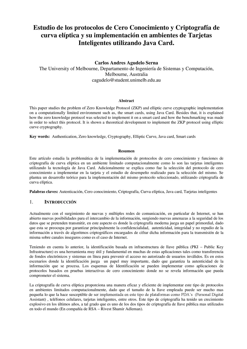 This paper studies the problem of Zero-Knowledge Protocol (ZKP) and elliptic curve cryptographic implementation in a computationally limited environment, such as, the smart cards, using Java Card. Besides that, it is explained how the zero-knowledge protocol was selected to implement it on a smart card and how the benchmarking was conducted to select this protocol. The paper also shows a theoretical development to implement the ZKP protocol using elliptic curve cryptography. Keywords: Authentication; Zero-knowledge; Cryptography; Elliptic Curve; Java card; Smart cards