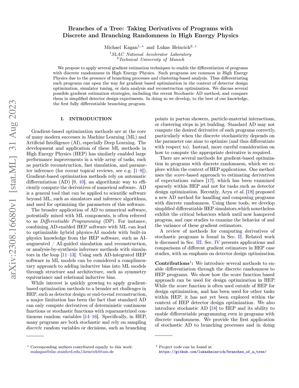 We propose to apply several gradient estimation techniques to enable the differentiation of programs with discrete randomness in High Energy Physics. Such programs are common in High Energy Physics due to the presence of branching processes and clustering-based analysis. Thus differentiating such programs can open the way for gradient based optimization in the context of detector design optimization, simulator tuning, or data analysis and reconstruction optimization. We discuss several possible gradient estimation strategies, including the recent Stochastic AD method, and compare them in simplified detector design experiments. In doing so we develop, to the best of our knowledge, the first fully differentiable branching program.
