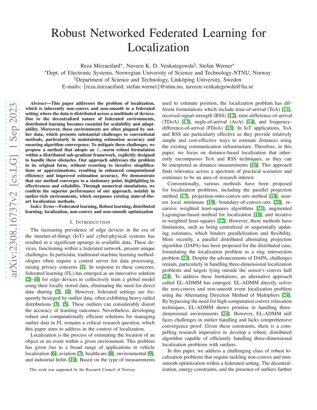 This paper addresses the problem of localization, which is inherently non-convex and non-smooth in a federated setting where the data is distributed across a multitude of devices. Due to the decentralized nature of federated environments, distributed learning becomes essential for scalability and adaptability. Moreover, these environments are often plagued by outlier data, which presents substantial challenges to conventional methods, particularly in maintaining estimation accuracy and ensuring algorithm convergence. To mitigate these challenges, we propose a method that adopts an -norm robust formulation within a distributed sub-gradient framework, explicitly designed to handle these obstacles. Our approach addresses the problem in its original form, without resorting to iterative simplifications or approximations, resulting in enhanced computational efficiency and improved estimation accuracy. We demonstrate that our method converges to a stationary point, highlighting its effectiveness and reliability. Through numerical simulations, we confirm the superior performance of our approach, notably in outlier-rich environments, which surpasses existing state-of-the-art localization methods.