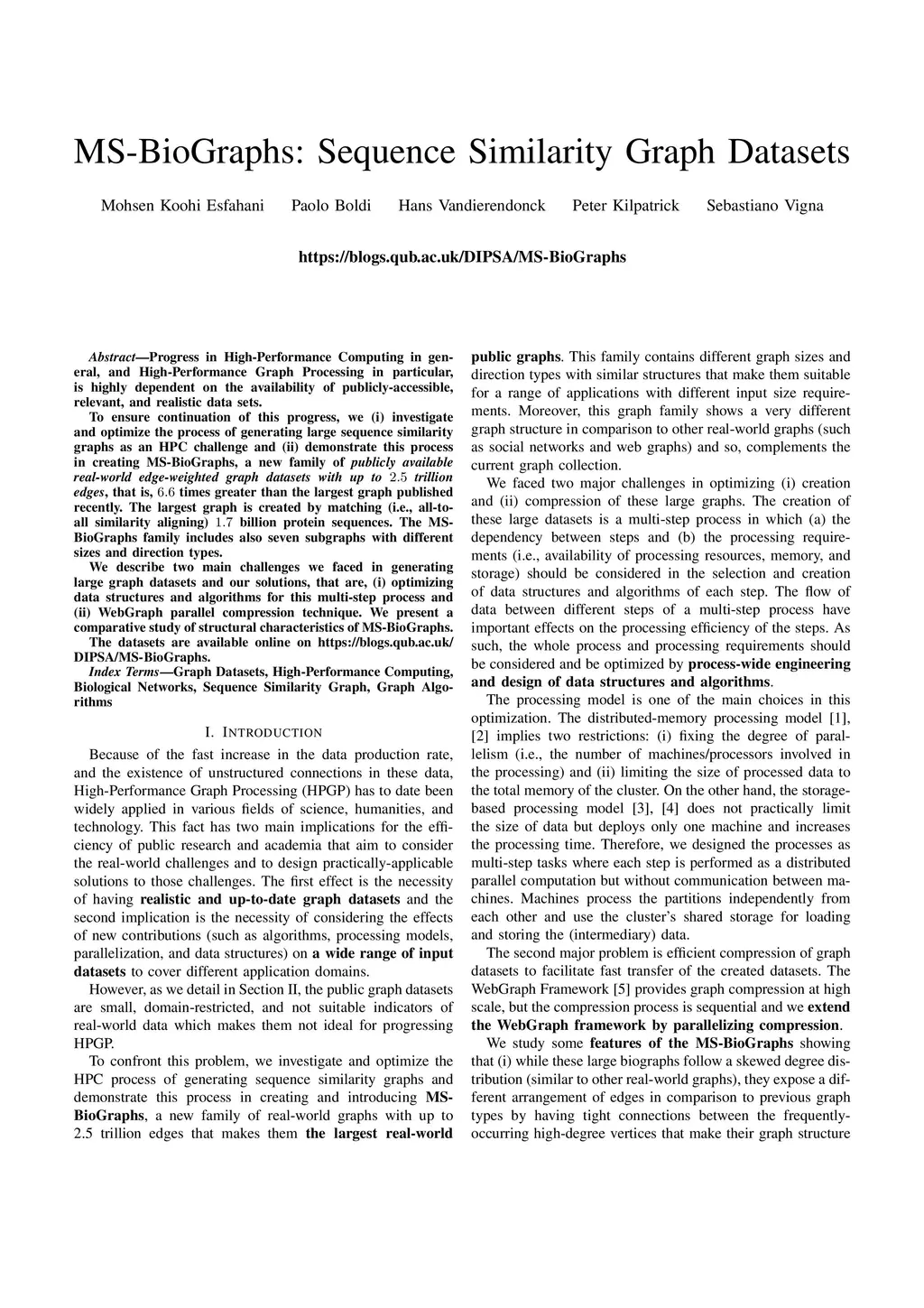 Progress in High-Performance Computing in general, and High-Performance Graph Processing in particular, is highly dependent on the availability of publicly-accessible, relevant, and realistic data sets. To ensure continuation of this progress, we (i) investigate and optimize the process of generating large sequence similarity graphs as an HPC challenge and (ii) demonstrate this process in creating MS-BioGraphs, a new family of publicly available real-world edge-weighted graph datasets with up to trillion edges, that is, times greater than the largest graph published recently. The largest graph is created by matching (i.e., all-to-all similarity aligning) billion protein sequences. The MS-BioGraphs family includes also seven subgraphs with different sizes and direction types. We describe two main challenges we faced in generating large graph datasets and our solutions, that are, (i) optimizing data structures and algorithms for this multi-step process and (ii) WebGraph parallel compression technique. We present a comparative study of structural characteristics of MS-BioGraphs. The datasets are available online on https://blogs.qub.ac.uk/DIPSA/MS-BioGraphs .