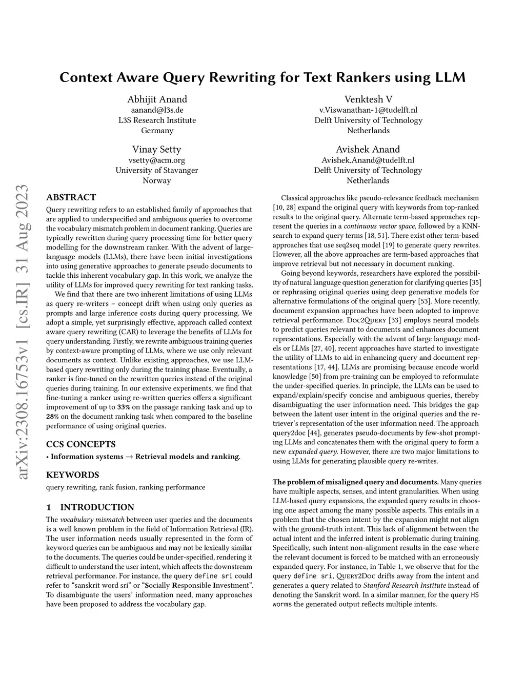 Context Aware Query Rewriting for Text Rankers using LLM