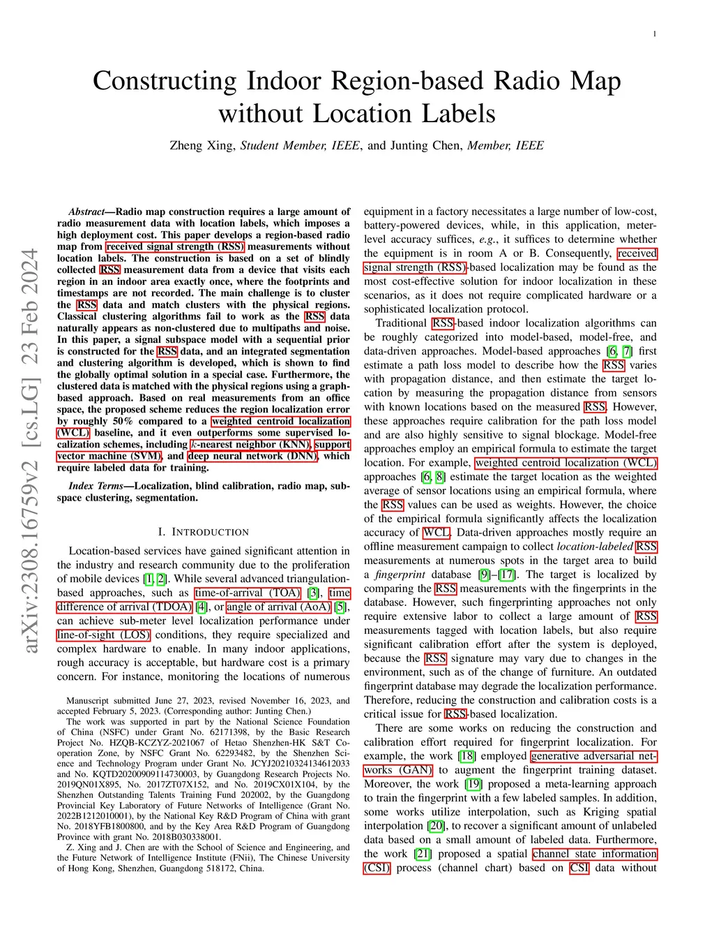 Radio map construction requires a large amount of radio measurement data with location labels, which imposes a high deployment cost. This paper develops a region-based radio map from received signal strength (RSS) measurements without location labels. The construction is based on a set of blindly collected RSS measurement data from a device that visits each region in an indoor area exactly once, where the footprints and timestamps are not recorded. The main challenge is to cluster the RSS data and match clusters with the physical regions. Classical clustering algorithms fail to work as the RSS data naturally appears as non-clustered due to multipaths and noise. In this paper, a signal subspace model with a sequential prior is constructed for the RSS data, and an integrated segmentation and clustering algorithm is developed, which is shown to find the globally optimal solution in a special case. Furthermore, the clustered data is matched with the physical regions using a graph-based approach. Based on real measurements from an office space, the proposed scheme reduces the region localization error by roughly 50% compared to a weighted centroid localization (WCL) baseline, and it even outperforms some supervised localization schemes, including k-nearest neighbor (KNN), support vector machine (SVM), and deep neural network (DNN), which require labeled data for training.