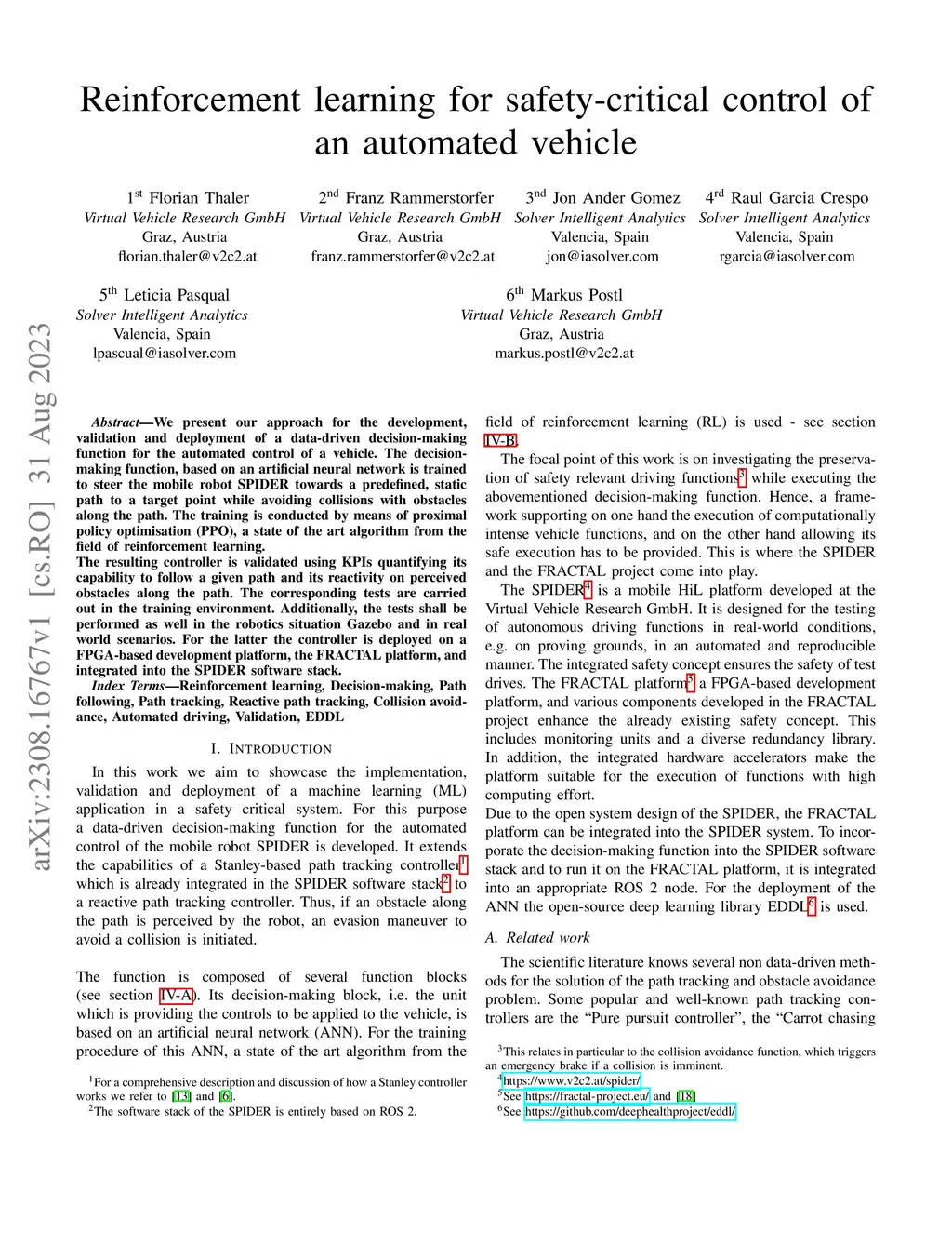 We present our approach for the development, validation and deployment of a data-driven decision-making function for the automated control of a vehicle. The decisionmaking function, based on an artificial neural network is trained to steer the mobile robot SPIDER towards a predefined, static path to a target point while avoiding collisions with obstacles along the path. The training is conducted by means of proximal policy optimisation (PPO), a state of the art algorithm from the field of reinforcement learning. The resulting controller is validated using KPIs quantifying its capability to follow a given path and its reactivity on perceived obstacles along the path. The corresponding tests are carried out in the training environment. Additionally, the tests shall be performed as well in the robotics situation Gazebo and in real world scenarios. For the latter the controller is deployed on a FPGA-based development platform, the FRACTAL platform, and integrated into the SPIDER software stack.