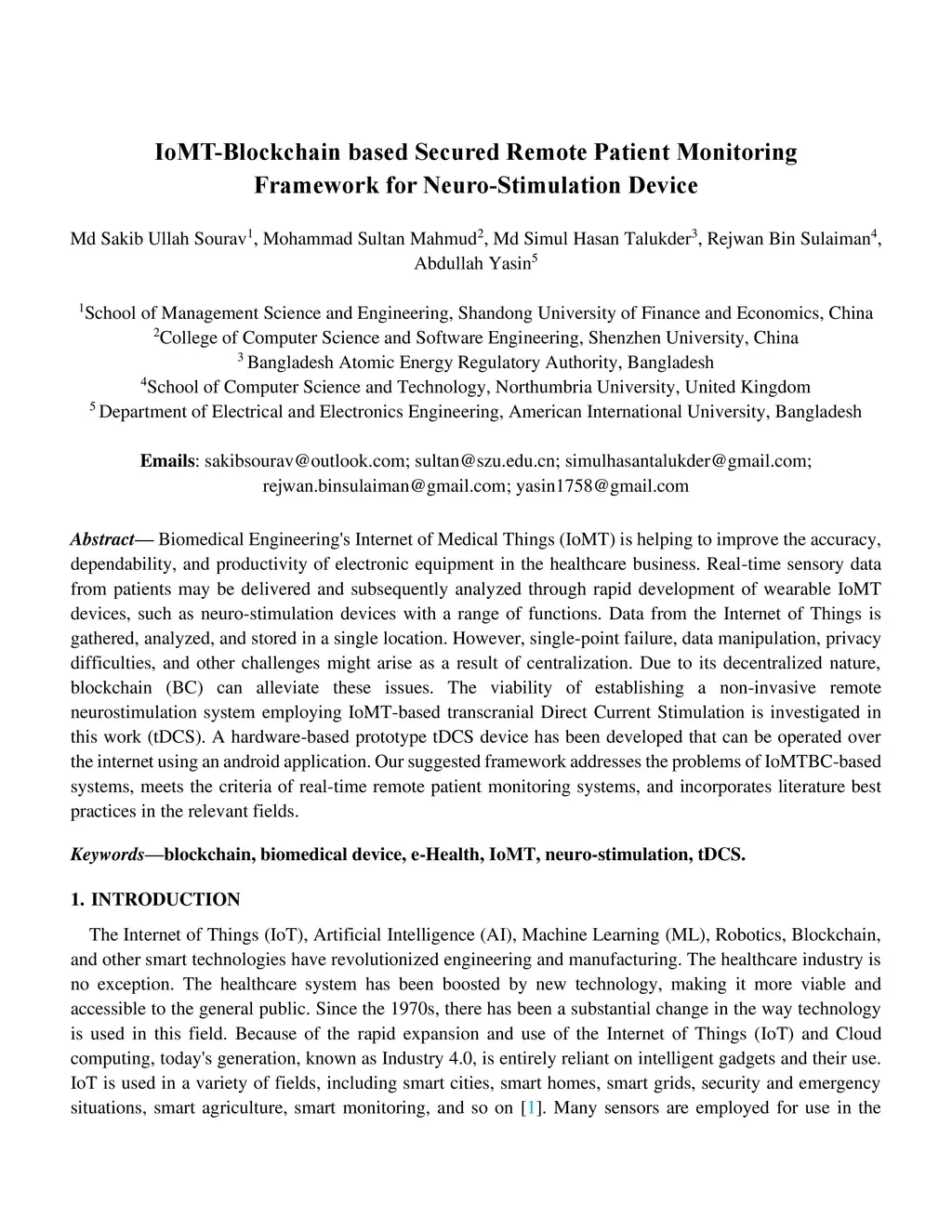 Biomedical Engineering's Internet of Medical Things (IoMT) is helping to improve the accuracy, dependability, and productivity of electronic equipment in the healthcare business. Real-time sensory data from patients may be delivered and subsequently analyzed through rapid development of wearable IoMT devices, such as neuro-stimulation devices with a range of functions. Data from the Internet of Things is gathered, analyzed, and stored in a single location. However, single-point failure, data manipulation, privacy difficulties, and other challenges might arise as a result of centralization. Due to its decentralized nature, blockchain (BC) can alleviate these issues. The viability of establishing a non-invasive remote neurostimulation system employing IoMT-based transcranial Direct Current Stimulation is investigated in this work (tDCS). A hardware-based prototype tDCS device has been developed that can be operated over the internet using an android application. Our suggested framework addresses the problems of IoMTBC-based systems, meets the criteria of real-time remote patient monitoring systems, and incorporates literature best practices in the relevant fields.