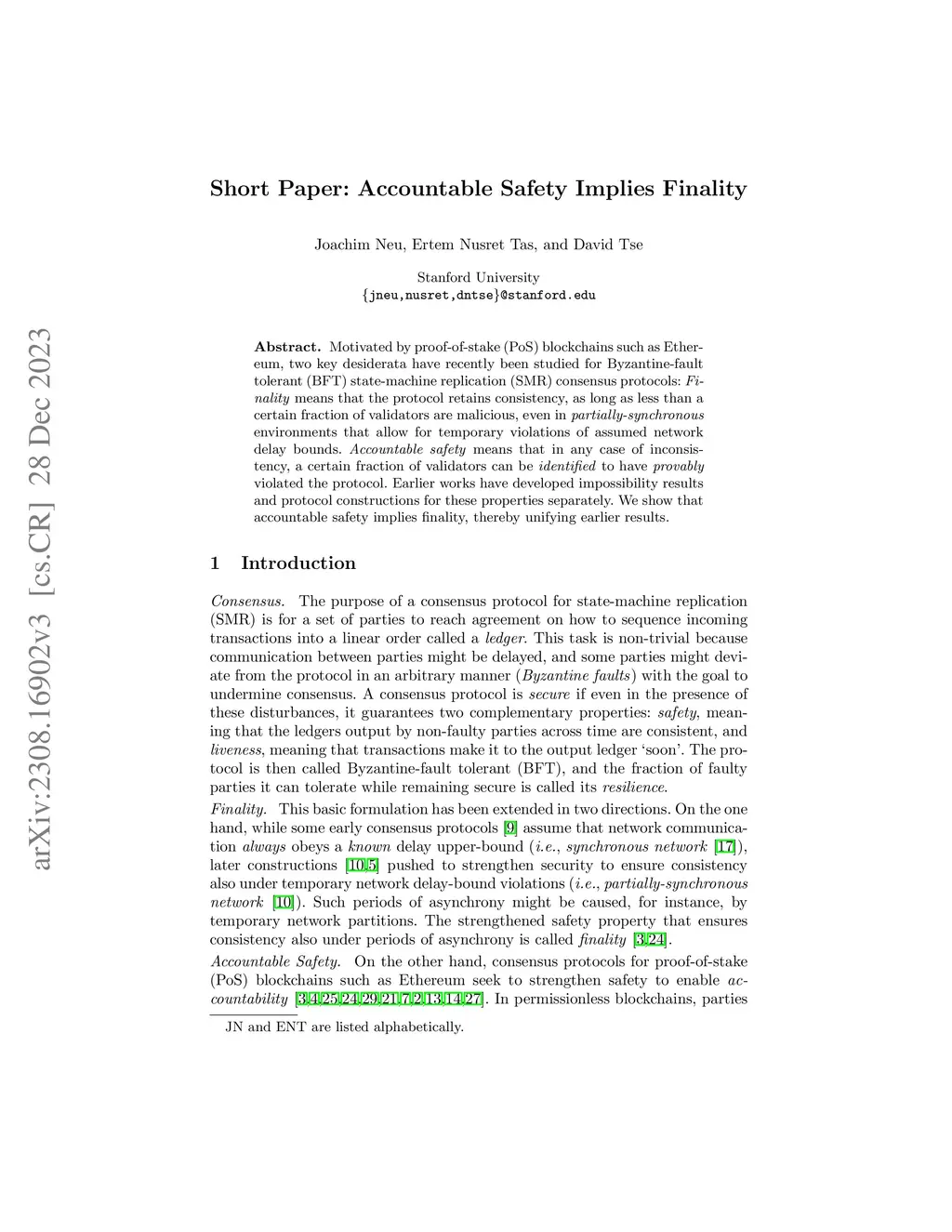 Motivated by proof-of-stake (PoS) blockchains such as Ethereum, two key desiderata have recently been studied for Byzantine-fault tolerant (BFT) state-machine replication (SMR) consensus protocols: Finality means that the protocol retains consistency, as long as less than a certain fraction of validators are malicious, even in partially-synchronous environments that allow for temporary violations of assumed network delay bounds. Accountable safety means that in any case of inconsistency, a certain fraction of validators can be identified to have provably violated the protocol. Earlier works have developed impossibility results and protocol constructions for these properties separately. We show that accountable safety implies finality, thereby unifying earlier results.