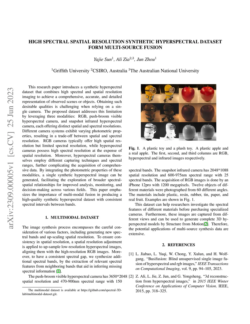 This research paper introduces a synthetic hyperspectral dataset that combines high spectral and spatial resolution imaging to achieve a comprehensive, accurate, and detailed representation of observed scenes or objects. Obtaining such desirable qualities is challenging when relying on a single camera. The proposed dataset addresses this limitation by leveraging three modalities: RGB, push-broom visible hyperspectral camera, and snapshot infrared hyperspectral camera, each offering distinct spatial and spectral resolutions. Different camera systems exhibit varying photometric properties, resulting in a trade-off between spatial and spectral resolution. RGB cameras typically offer high spatial resolution but limited spectral resolution, while hyperspectral cameras possess high spectral resolution at the expense of spatial resolution. Moreover, hyperspectral cameras themselves employ different capturing techniques and spectral ranges, further complicating the acquisition of comprehensive data. By integrating the photometric properties of these modalities, a single synthetic hyperspectral image can be generated, facilitating the exploration of broader spectral-spatial relationships for improved analysis, monitoring, and decision-making across various fields. This paper emphasizes the importance of multi-modal fusion in producing a high-quality synthetic hyperspectral dataset with consistent spectral intervals between bands.
