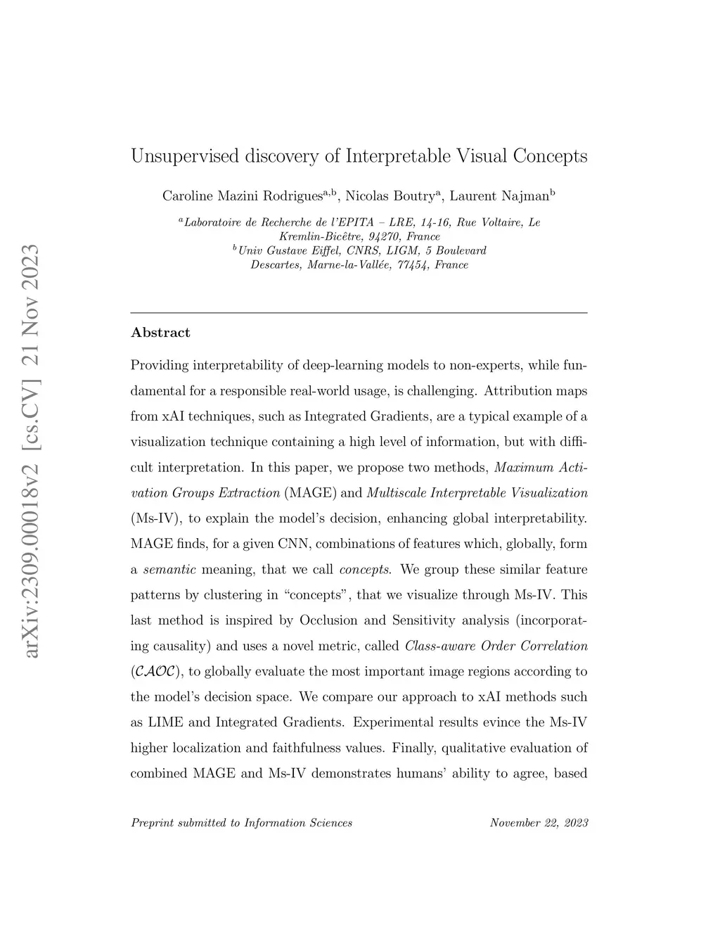 Providing interpretability of deep-learning models to non-experts, while fundamental for a responsible real-world usage, is challenging. Attribution maps from xAI techniques, such as Integrated Gradients, are a typical example of a visualization technique containing a high level of information, but with difficult interpretation. In this paper, we propose two methods, Maximum Activation Groups Extraction (MAGE) and Multiscale Interpretable Visualization (Ms-IV), to explain the model's decision, enhancing global interpretability. MAGE finds, for a given CNN, combinations of features which, globally, form a semantic meaning, that we call concepts. We group these similar feature patterns by clustering in ``concepts'', that we visualize through Ms-IV. This last method is inspired by Occlusion and Sensitivity analysis (incorporating causality), and uses a novel metric, called Class-aware Order Correlation (CaOC), to globally evaluate the most important image regions according to the model's decision space. We compare our approach to xAI methods such as LIME and Integrated Gradients. Experimental results evince the Ms-IV higher localization and faithfulness values. Finally, qualitative evaluation of combined MAGE and Ms-IV demonstrates humans' ability to agree, based on the visualization, with the decision of clusters' concepts; and, to detect, among a given set of networks, the existence of bias.