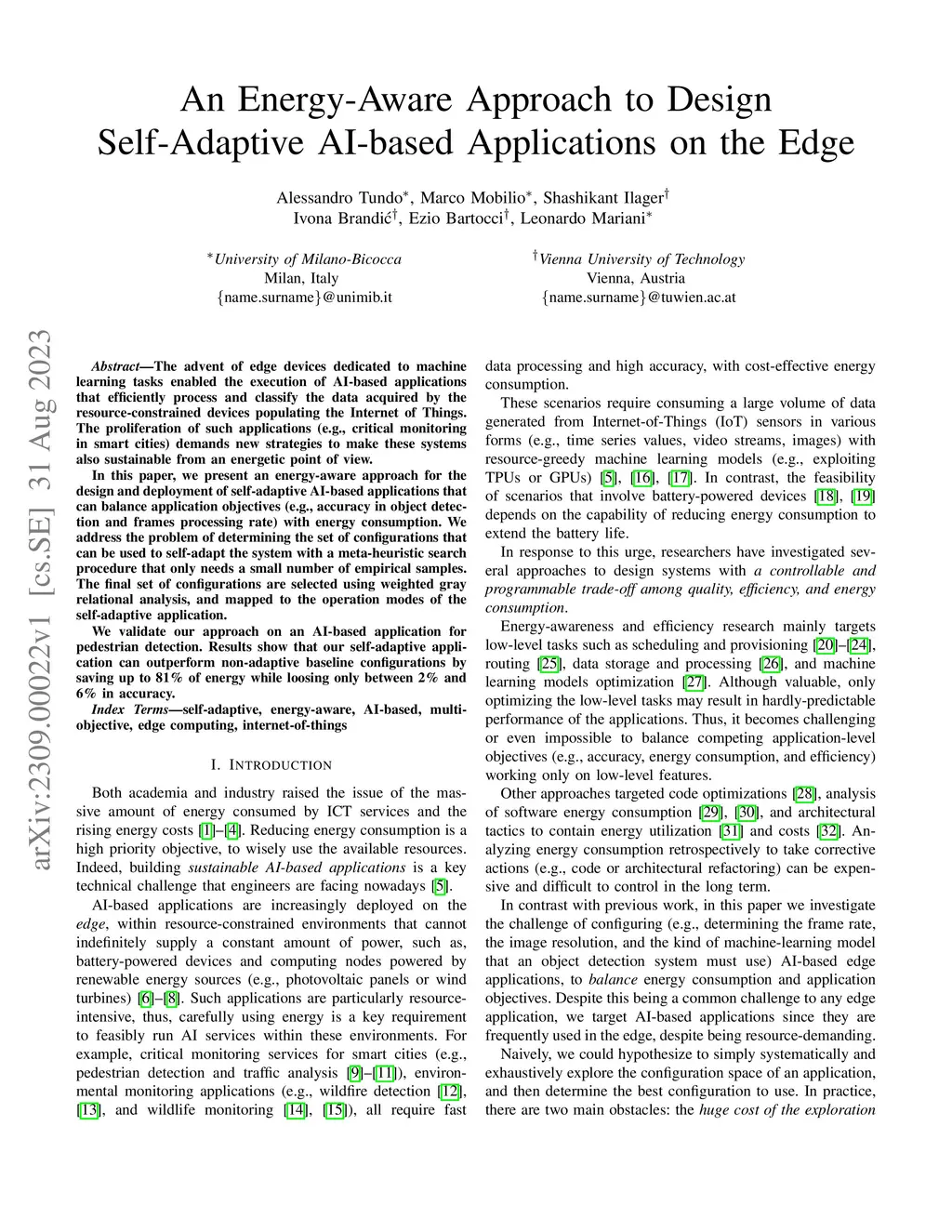 The advent of edge devices dedicated to machine learning tasks enabled the execution of AI-based applications that efficiently process and classify the data acquired by the resource-constrained devices populating the Internet of Things. The proliferation of such applications (e.g., critical monitoring in smart cities) demands new strategies to make these systems also sustainable from an energetic point of view. In this paper, we present an energy-aware approach for the design and deployment of self-adaptive AI-based applications that can balance application objectives (e.g., accuracy in object detection and frames processing rate) with energy consumption. We address the problem of determining the set of configurations that can be used to self-adapt the system with a meta-heuristic search procedure that only needs a small number of empirical samples. The final set of configurations are selected using weighted gray relational analysis, and mapped to the operation modes of the self-adaptive application. We validate our approach on an AI-based application for pedestrian detection. Results show that our self-adaptive application can outperform non-adaptive baseline configurations by saving up to 81\% of energy while loosing only between 2% and 6% in accuracy.
