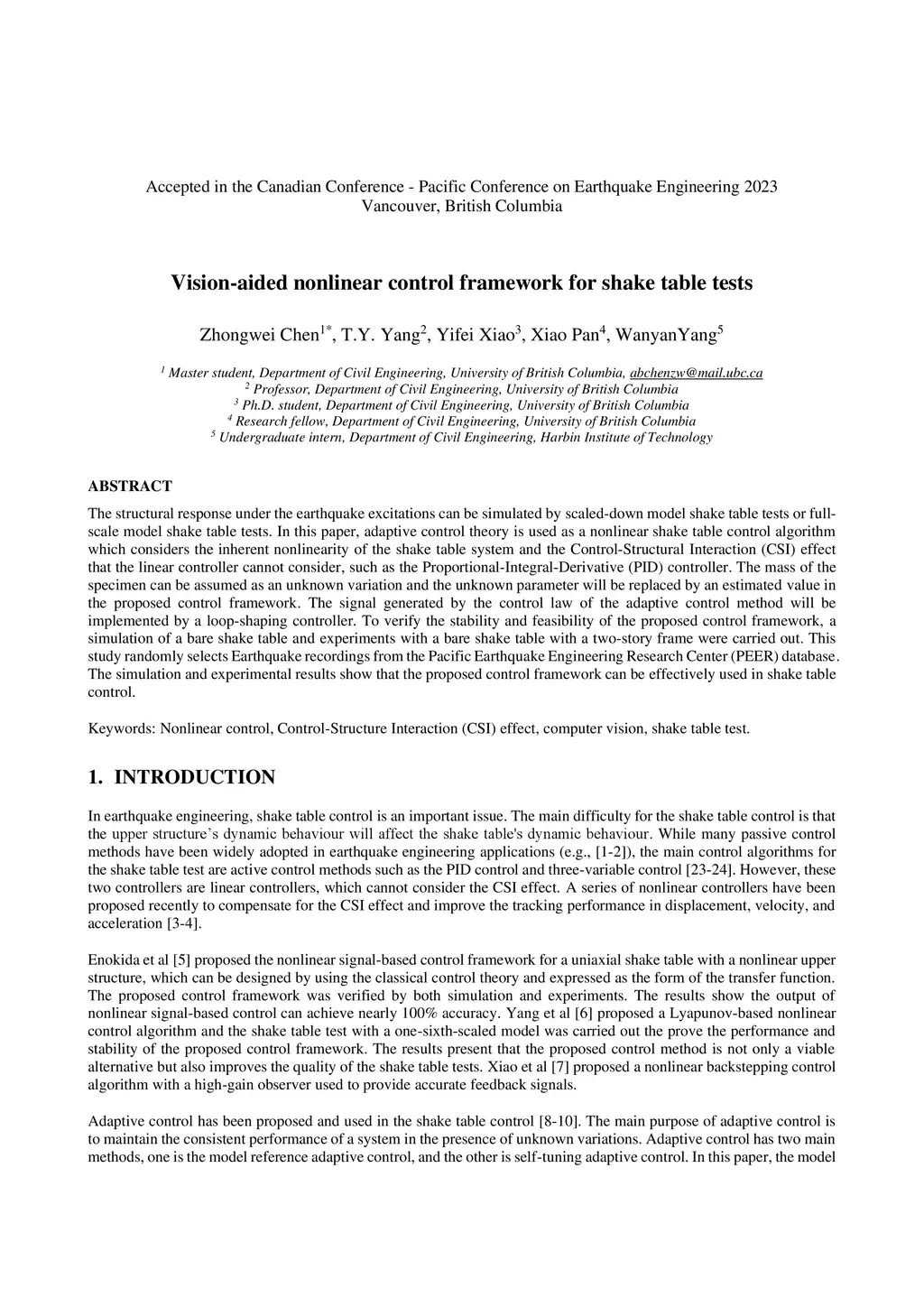The structural response under the earthquake excitations can be simulated by scaled-down model shake table tests or full-scale model shake table tests. In this paper, adaptive control theory is used as a nonlinear shake table control algorithm which considers the inherent nonlinearity of the shake table system and the Control-Structural Interaction (CSI) effect that the linear controller cannot consider, such as the Proportional-Integral-Derivative (PID) controller. The mass of the specimen can be assumed as an unknown variation and the unknown parameter will be replaced by an estimated value in the proposed control framework. The signal generated by the control law of the adaptive control method will be implemented by a loop-shaping controller. To verify the stability and feasibility of the proposed control framework, a simulation of a bare shake table and experiments with a bare shake table with a two-story frame were carried out. This study randomly selects Earthquake recordings from the Pacific Earthquake Engineering Research Center (PEER) database. The simulation and experimental results show that the proposed control framework can be effectively used in shake table control.