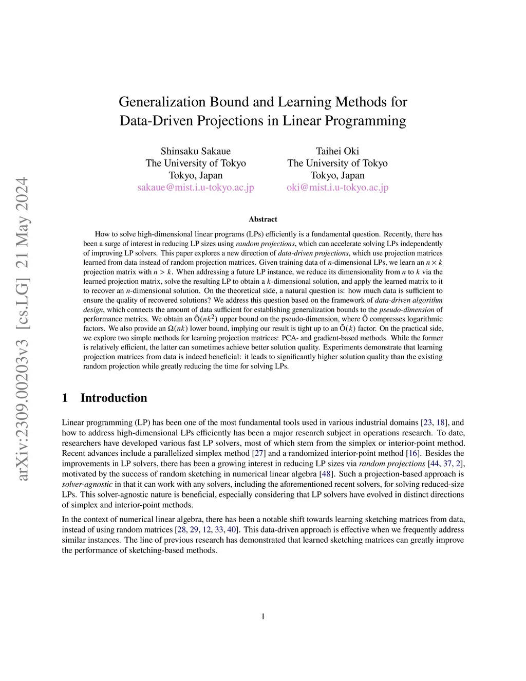 Generalization Bound and Learning Methods for Data-Driven Projections in