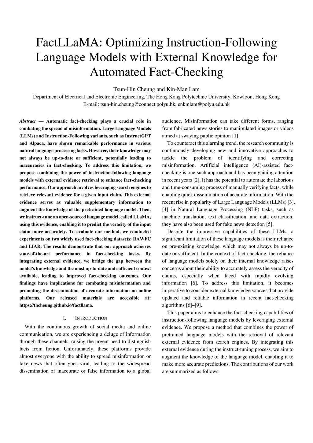 Automatic fact-checking plays a crucial role in combating the spread of misinformation. Large Language Models (LLMs) and Instruction-Following variants, such as InstructGPT and Alpaca, have shown remarkable performance in various natural language processing tasks. However, their knowledge may not always be up-to-date or sufficient, potentially leading to inaccuracies in fact-checking. To address this limitation, we propose combining the power of instruction-following language models with external evidence retrieval to enhance fact-checking performance. Our approach involves leveraging search engines to retrieve relevant evidence for a given input claim. This external evidence serves as valuable supplementary information to augment the knowledge of the pretrained language model. Then, we instruct-tune an open-sourced language model, called LLaMA, using this evidence, enabling it to predict the veracity of the input claim more accurately. To evaluate our method, we conducted experiments on two widely used fact-checking datasets: RAWFC and LIAR. The results demonstrate that our approach achieves state-of-the-art performance in fact-checking tasks. By integrating external evidence, we bridge the gap between the model's knowledge and the most up-to-date and sufficient context available, leading to improved fact-checking outcomes. Our findings have implications for combating misinformation and promoting the dissemination of accurate information on online platforms. Our released materials are accessible at: https://thcheung.github.io/factllama.