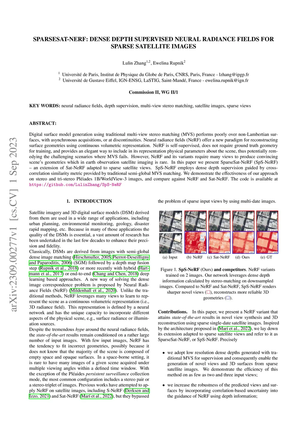 Digital surface model generation using traditional multi-view stereo matching (MVS) performs poorly over non-Lambertian surfaces, with asynchronous acquisitions, or at discontinuities. Neural radiance fields (NeRF) offer a new paradigm for reconstructing surface geometries using continuous volumetric representation. NeRF is self-supervised, does not require ground truth geometry for training, and provides an elegant way to include in its representation physical parameters about the scene, thus potentially remedying the challenging scenarios where MVS fails. However, NeRF and its variants require many views to produce convincing scene's geometries which in earth observation satellite imaging is rare. In this paper we present SparseSat-NeRF (SpS-NeRF) - an extension of Sat-NeRF adapted to sparse satellite views. SpS-NeRF employs dense depth supervision guided by crosscorrelation similarity metric provided by traditional semi-global MVS matching. We demonstrate the effectiveness of our approach on stereo and tri-stereo Pleiades 1B/WorldView-3 images, and compare against NeRF and Sat-NeRF. The code is available at https://github.com/LulinZhang/SpS-NeRF