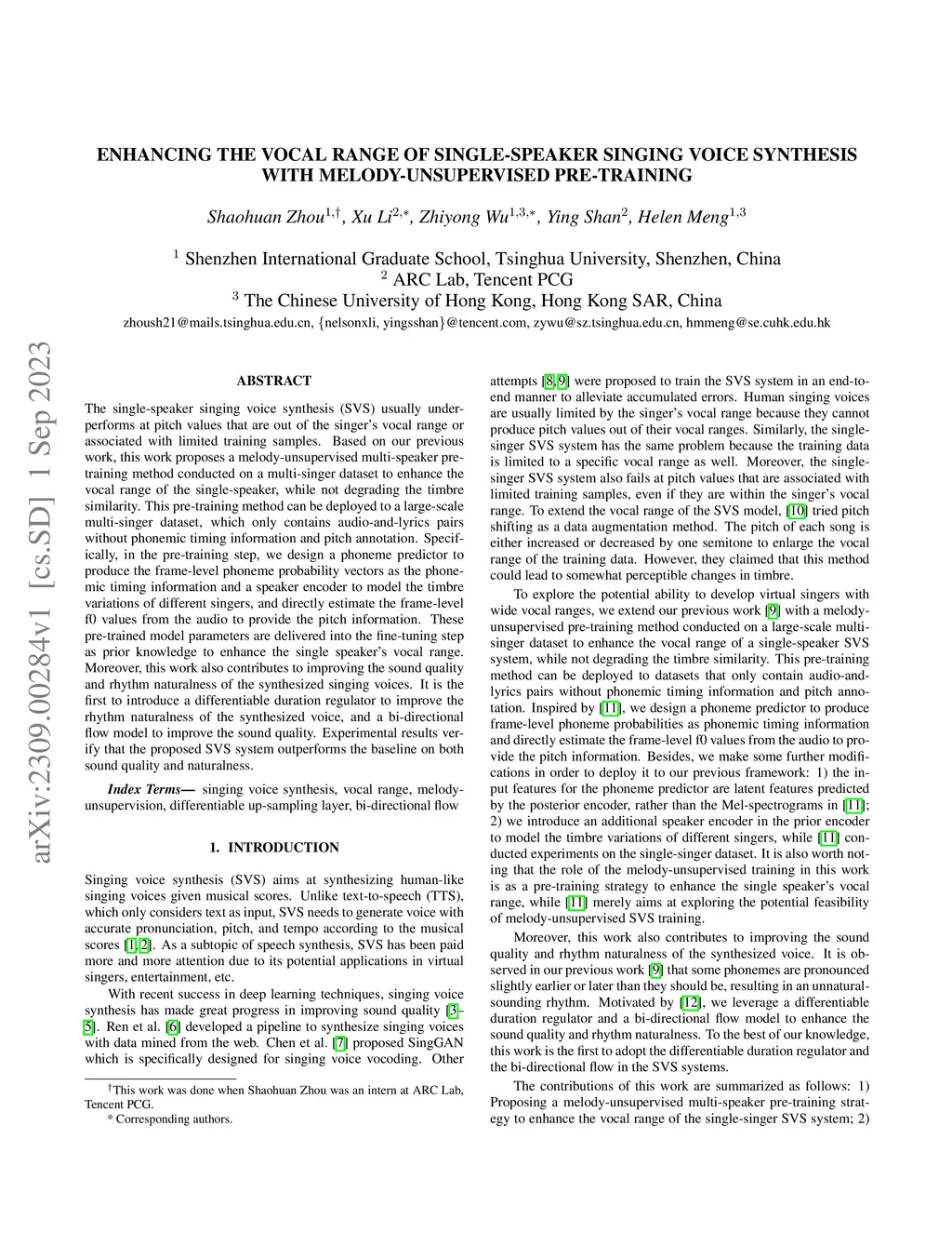The single-speaker singing voice synthesis (SVS) usually underperforms at pitch values that are out of the singer's vocal range or associated with limited training samples. Based on our previous work, this work proposes a melody-unsupervised multi-speaker pre-training method conducted on a multi-singer dataset to enhance the vocal range of the single-speaker, while not degrading the timbre similarity. This pre-training method can be deployed to a large-scale multi-singer dataset, which only contains audio-and-lyrics pairs without phonemic timing information and pitch annotation. Specifically, in the pre-training step, we design a phoneme predictor to produce the frame-level phoneme probability vectors as the phonemic timing information and a speaker encoder to model the timbre variations of different singers, and directly estimate the frame-level f0 values from the audio to provide the pitch information. These pre-trained model parameters are delivered into the fine-tuning step as prior knowledge to enhance the single speaker's vocal range. Moreover, this work also contributes to improving the sound quality and rhythm naturalness of the synthesized singing voices. It is the first to introduce a differentiable duration regulator to improve the rhythm naturalness of the synthesized voice, and a bi-directional flow model to improve the sound quality. Experimental results verify that the proposed SVS system outperforms the baseline on both sound quality and naturalness.