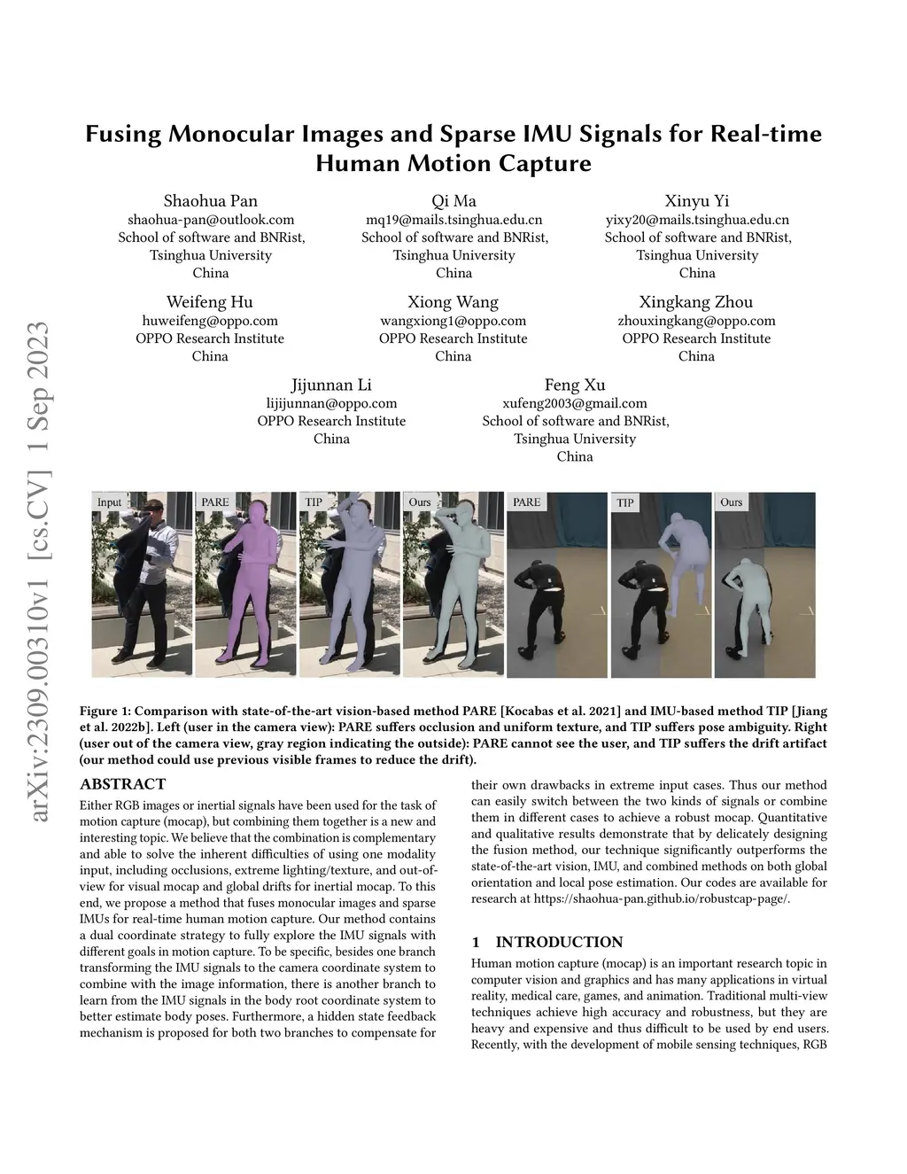 Fusing Monocular Images and Sparse IMU Signals for Real-time Human