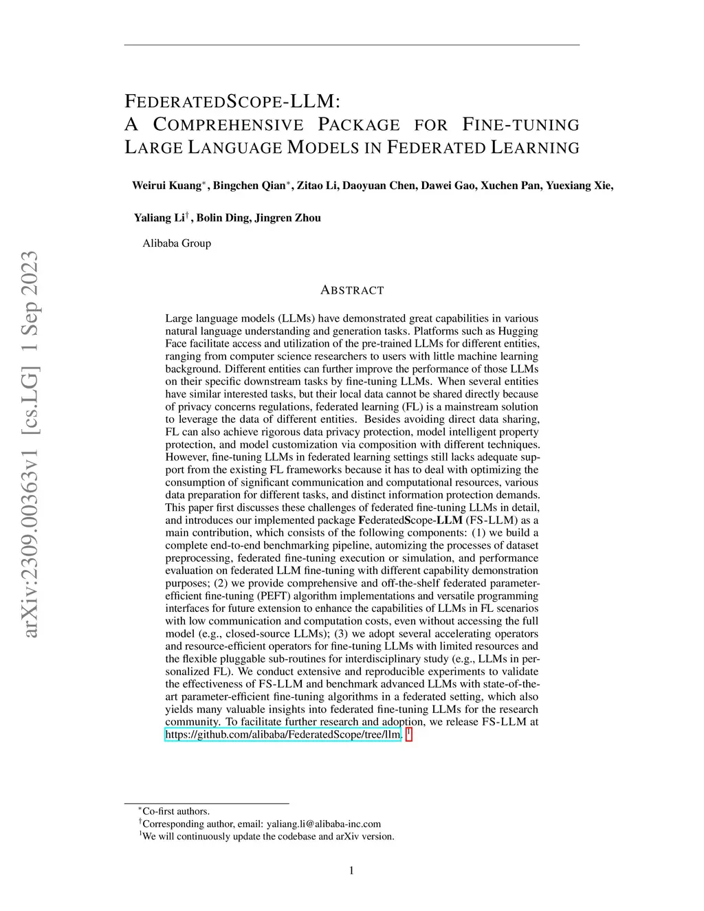 LLMs have demonstrated great capabilities in various NLP tasks. Different entities can further improve the performance of those LLMs on their specific downstream tasks by fine-tuning LLMs. When several entities have similar interested tasks, but their data cannot be shared because of privacy concerns regulations, federated learning (FL) is a mainstream solution to leverage the data of different entities. However, fine-tuning LLMs in federated learning settings still lacks adequate support from existing FL frameworks because it has to deal with optimizing the consumption of significant communication and computational resources, data preparation for different tasks, and distinct information protection demands. This paper first discusses these challenges of federated fine-tuning LLMs, and introduces our package FS-LLM as a main contribution, which consists of the following components: (1) we build an end-to-end benchmarking pipeline, automizing the processes of dataset preprocessing, federated fine-tuning execution, and performance evaluation on federated LLM fine-tuning; (2) we provide comprehensive federated parameter-efficient fine-tuning algorithm implementations and versatile programming interfaces for future extension in FL scenarios with low communication and computation costs, even without accessing the full model; (3) we adopt several accelerating and resource-efficient operators for fine-tuning LLMs with limited resources and the flexible pluggable sub-routines for interdisciplinary study. We conduct extensive experiments to validate the effectiveness of FS-LLM and benchmark advanced LLMs with state-of-the-art parameter-efficient fine-tuning algorithms in FL settings, which also yields valuable insights into federated fine-tuning LLMs for the research community. To facilitate further research and adoption, we release FS-LLM at https://github.com/alibaba/FederatedScope/tree/llm.