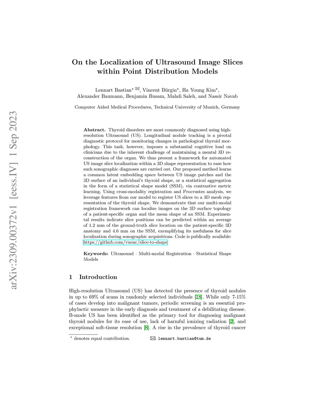 Thyroid disorders are most commonly diagnosed using high-resolution Ultrasound (US). Longitudinal nodule tracking is a pivotal diagnostic protocol for monitoring changes in pathological thyroid morphology. This task, however, imposes a substantial cognitive load on clinicians due to the inherent challenge of maintaining a mental 3D reconstruction of the organ. We thus present a framework for automated US image slice localization within a 3D shape representation to ease how such sonographic diagnoses are carried out. Our proposed method learns a common latent embedding space between US image patches and the 3D surface of an individual's thyroid shape, or a statistical aggregation in the form of a statistical shape model (SSM), via contrastive metric learning. Using cross-modality registration and Procrustes analysis, we leverage features from our model to register US slices to a 3D mesh representation of the thyroid shape. We demonstrate that our multi-modal registration framework can localize images on the 3D surface topology of a patient-specific organ and the mean shape of an SSM. Experimental results indicate slice positions can be predicted within an average of 1.2 mm of the ground-truth slice location on the patient-specific 3D anatomy and 4.6 mm on the SSM, exemplifying its usefulness for slice localization during sonographic acquisitions. Code is publically available: \href{https://github.com/vuenc/slice-to-shape}{https://github.com/vuenc/slice-to-shape}