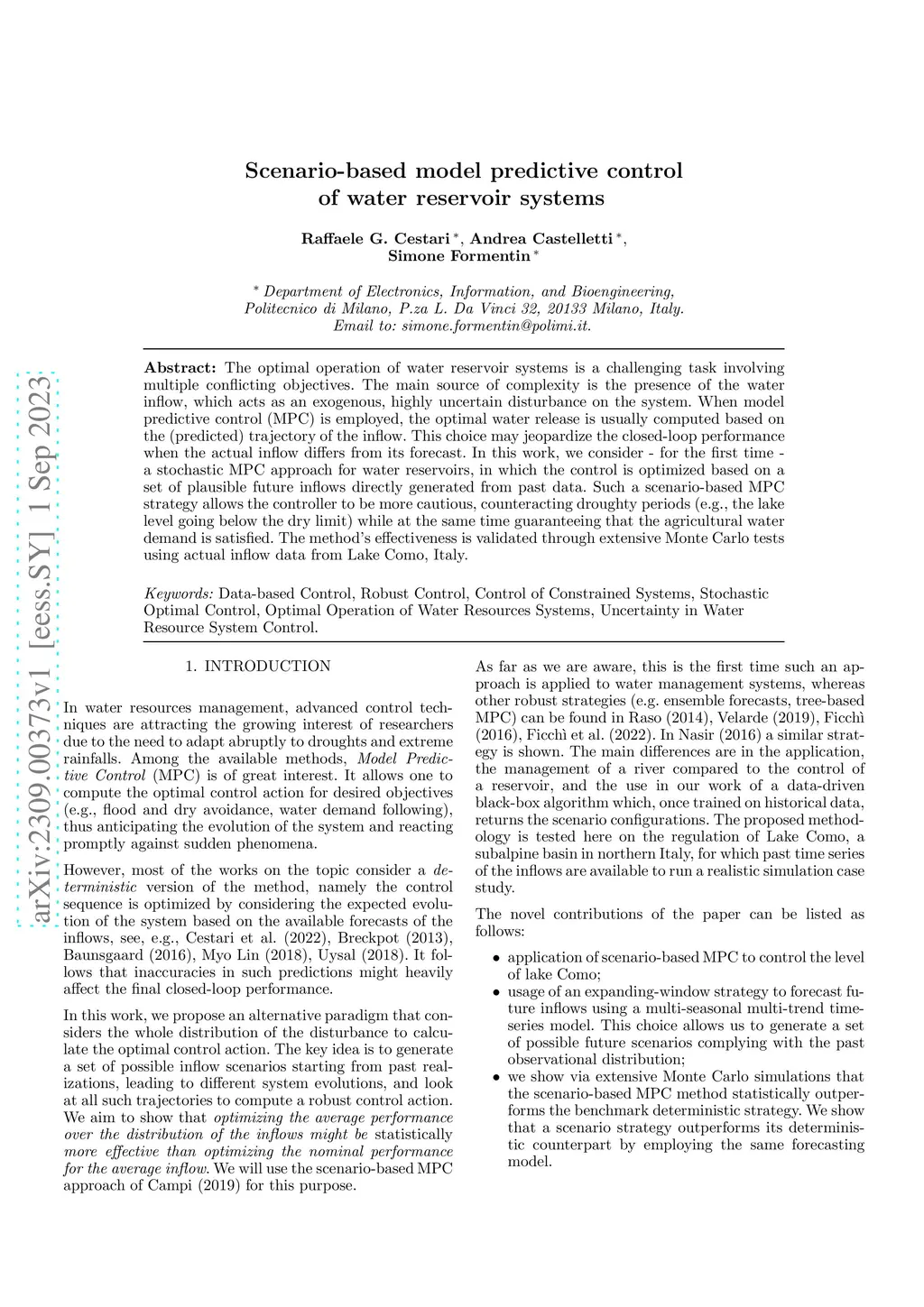 The optimal operation of water reservoir systems is a challenging task involving multiple conflicting objectives. The main source of complexity is the presence of the water inflow, which acts as an exogenous, highly uncertain disturbance on the system. When model predictive control (MPC) is employed, the optimal water release is usually computed based on the (predicted) trajectory of the inflow. This choice may jeopardize the closed-loop performance when the actual inflow differs from its forecast. In this work, we consider - for the first time - a stochastic MPC approach for water reservoirs, in which the control is optimized based on a set of plausible future inflows directly generated from past data. Such a scenario-based MPC strategy allows the controller to be more cautious, counteracting droughty periods (e.g., the lake level going below the dry limit) while at the same time guaranteeing that the agricultural water demand is satisfied. The method's effectiveness is validated through extensive Monte Carlo tests using actual inflow data from Lake Como, Italy.