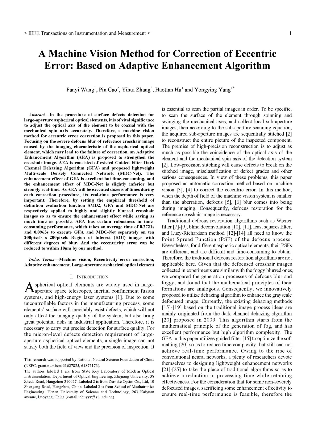 In the procedure of surface defects detection for large-aperture aspherical optical elements, it is of vital significance to adjust the optical axis of the element to be coaxial with the mechanical spin axis accurately. Therefore, a machine vision method for eccentric error correction is proposed in this paper. Focusing on the severe defocus blur of reference crosshair image caused by the imaging characteristic of the aspherical optical element, which may lead to the failure of correction, an Adaptive Enhancement Algorithm (AEA) is proposed to strengthen the crosshair image. AEA is consisted of existed Guided Filter Dark Channel Dehazing Algorithm (GFA) and proposed lightweight Multi-scale Densely Connected Network (MDC-Net). The enhancement effect of GFA is excellent but time-consuming, and the enhancement effect of MDC-Net is slightly inferior but strongly real-time. As AEA will be executed dozens of times during each correction procedure, its real-time performance is very important. Therefore, by setting the empirical threshold of definition evaluation function SMD2, GFA and MDC-Net are respectively applied to highly and slightly blurred crosshair images so as to ensure the enhancement effect while saving as much time as possible. AEA has certain robustness in time-consuming performance, which takes an average time of 0.2721s and 0.0963s to execute GFA and MDC-Net separately on ten 200pixels 200pixels Region of Interest (ROI) images with different degrees of blur. And the eccentricity error can be reduced to within 10um by our method.