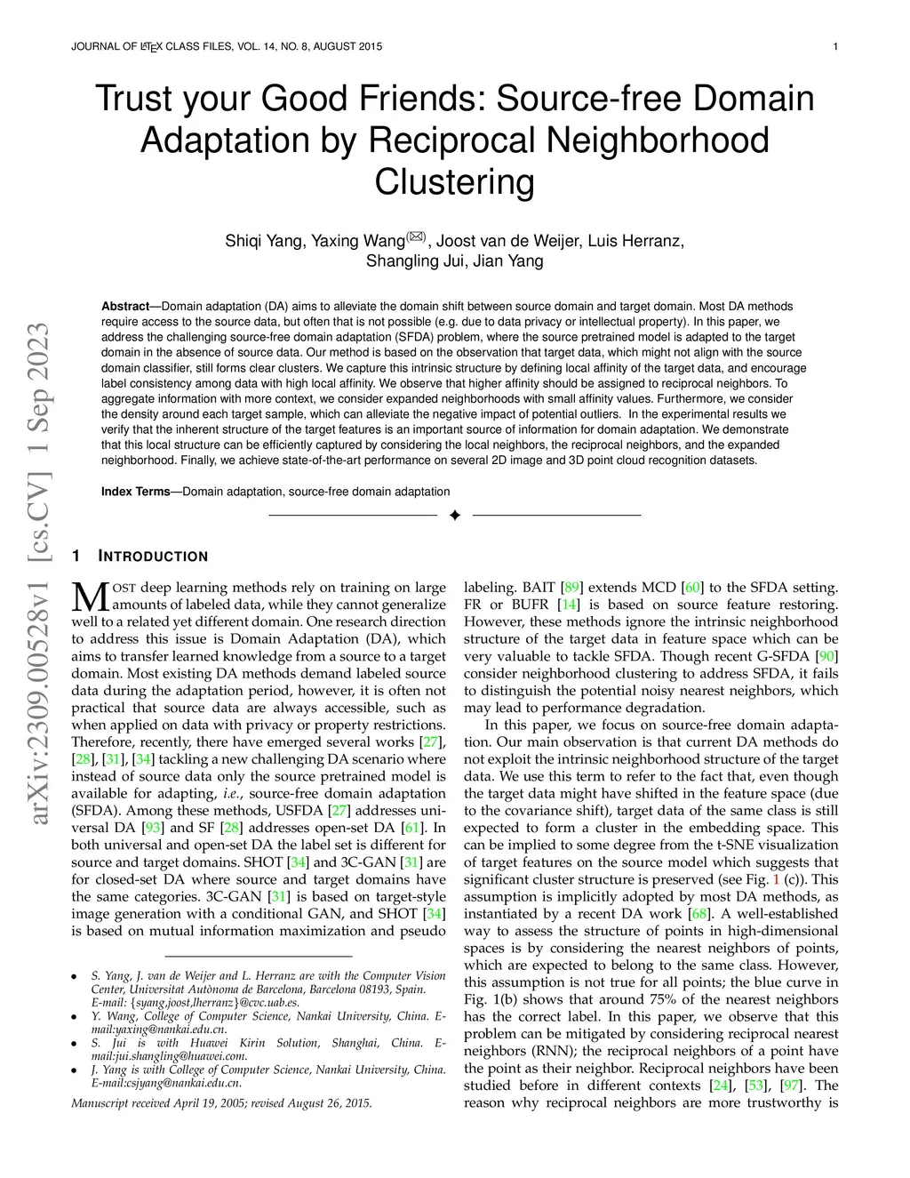Domain adaptation (DA) aims to alleviate the domain shift between source domain and target domain. Most DA methods require access to the source data, but often that is not possible (e.g. due to data privacy or intellectual property). In this paper, we address the challenging source-free domain adaptation (SFDA) problem, where the source pretrained model is adapted to the target domain in the absence of source data. Our method is based on the observation that target data, which might not align with the source domain classifier, still forms clear clusters. We capture this intrinsic structure by defining local affinity of the target data, and encourage label consistency among data with high local affinity. We observe that higher affinity should be assigned to reciprocal neighbors. To aggregate information with more context, we consider expanded neighborhoods with small affinity values. Furthermore, we consider the density around each target sample, which can alleviate the negative impact of potential outliers. In the experimental results we verify that the inherent structure of the target features is an important source of information for domain adaptation. We demonstrate that this local structure can be efficiently captured by considering the local neighbors, the reciprocal neighbors, and the expanded neighborhood. Finally, we achieve state-of-the-art performance on several 2D image and 3D point cloud recognition datasets.