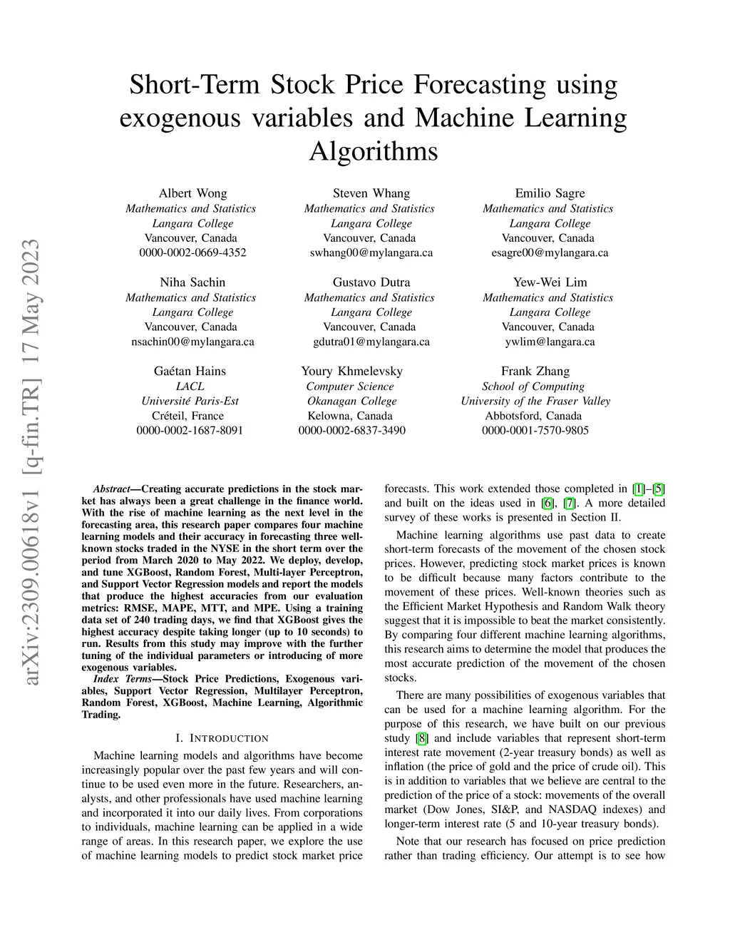 Short-Term Stock Price Forecasting using exogenous variables and Machine