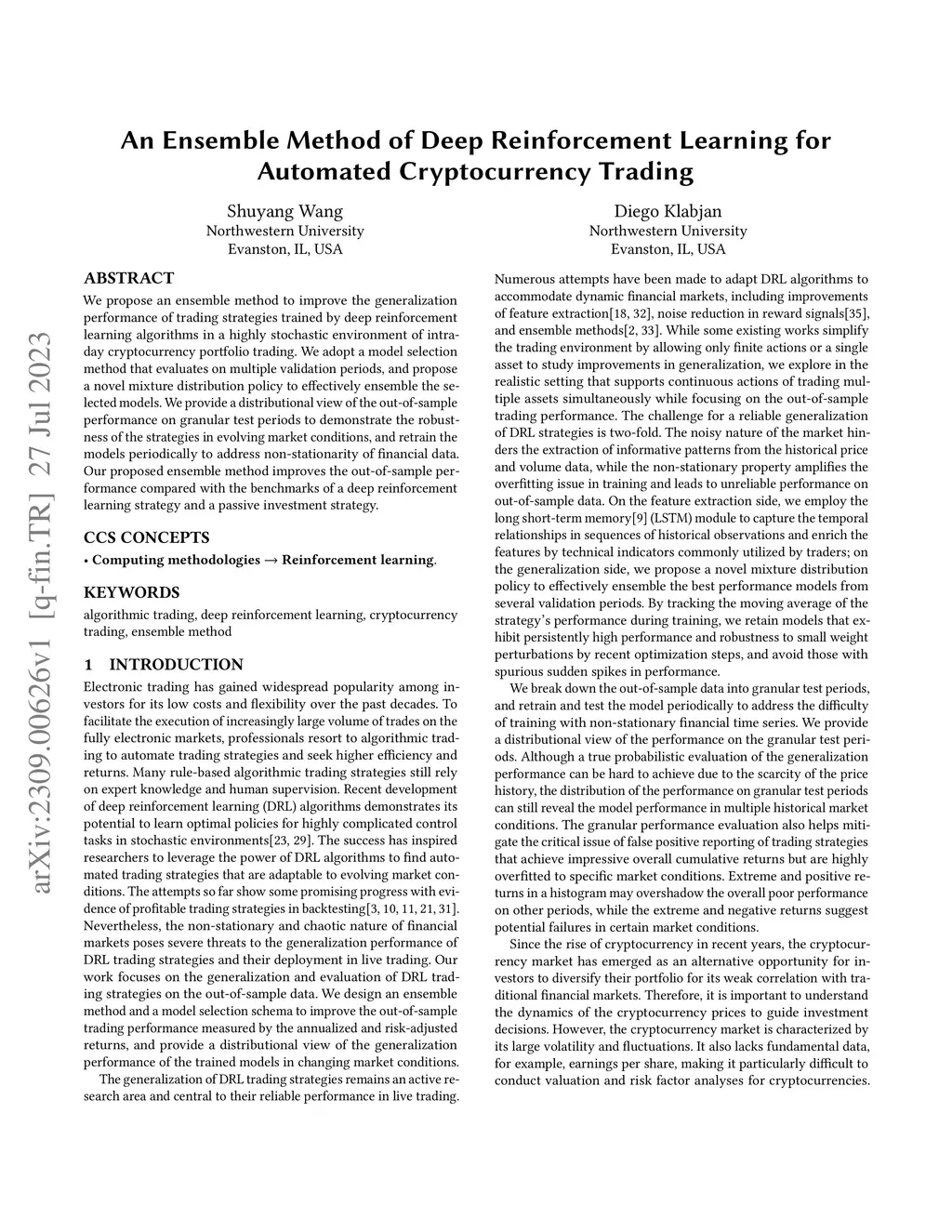 We propose an ensemble method to improve the generalization performance of trading strategies trained by deep reinforcement learning algorithms in a highly stochastic environment of intraday cryptocurrency portfolio trading. We adopt a model selection method that evaluates on multiple validation periods, and propose a novel mixture distribution policy to effectively ensemble the selected models. We provide a distributional view of the out-of-sample performance on granular test periods to demonstrate the robustness of the strategies in evolving market conditions, and retrain the models periodically to address non-stationarity of financial data. Our proposed ensemble method improves the out-of-sample performance compared with the benchmarks of a deep reinforcement learning strategy and a passive investment strategy.