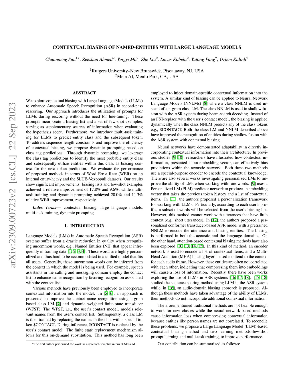 This paper studies contextual biasing with Large Language Models (LLMs), where during second-pass rescoring additional contextual information is provided to a LLM to boost Automatic Speech Recognition (ASR) performance. We propose to leverage prompts for a LLM without fine tuning during rescoring which incorporate a biasing list and few-shot examples to serve as additional information when calculating the score for the hypothesis. In addition to few-shot prompt learning, we propose multi-task training of the LLM to predict both the entity class and the next token. To improve the efficiency for contextual biasing and to avoid exceeding LLMs' maximum sequence lengths, we propose dynamic prompting, where we select the most likely class using the class tag prediction, and only use entities in this class as contexts for next token prediction. Word Error Rate (WER) evaluation is performed on i) an internal calling, messaging, and dictation dataset, and ii) the SLUE-Voxpopuli dataset. Results indicate that biasing lists and few-shot examples can achieve 17.8% and 9.6% relative improvement compared to first pass ASR, and that multi-task training and dynamic prompting can achieve 20.0% and 11.3% relative WER improvement, respectively.