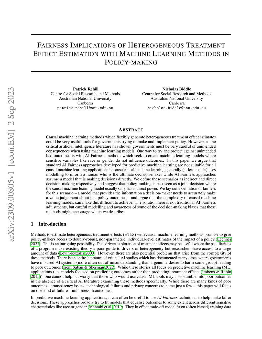 Causal machine learning methods which flexibly generate heterogeneous treatment effect estimates could be very useful tools for governments trying to make and implement policy. However, as the critical artificial intelligence literature has shown, governments must be very careful of unintended consequences when using machine learning models. One way to try and protect against unintended bad outcomes is with AI Fairness methods which seek to create machine learning models where sensitive variables like race or gender do not influence outcomes. In this paper we argue that standard AI Fairness approaches developed for predictive machine learning are not suitable for all causal machine learning applications because causal machine learning generally (at least so far) uses modelling to inform a human who is the ultimate decision-maker while AI Fairness approaches assume a model that is making decisions directly. We define these scenarios as indirect and direct decision-making respectively and suggest that policy-making is best seen as a joint decision where the causal machine learning model usually only has indirect power. We lay out a definition of fairness for this scenario - a model that provides the information a decision-maker needs to accurately make a value judgement about just policy outcomes - and argue that the complexity of causal machine learning models can make this difficult to achieve. The solution here is not traditional AI Fairness adjustments, but careful modelling and awareness of some of the decision-making biases that these methods might encourage which we describe.